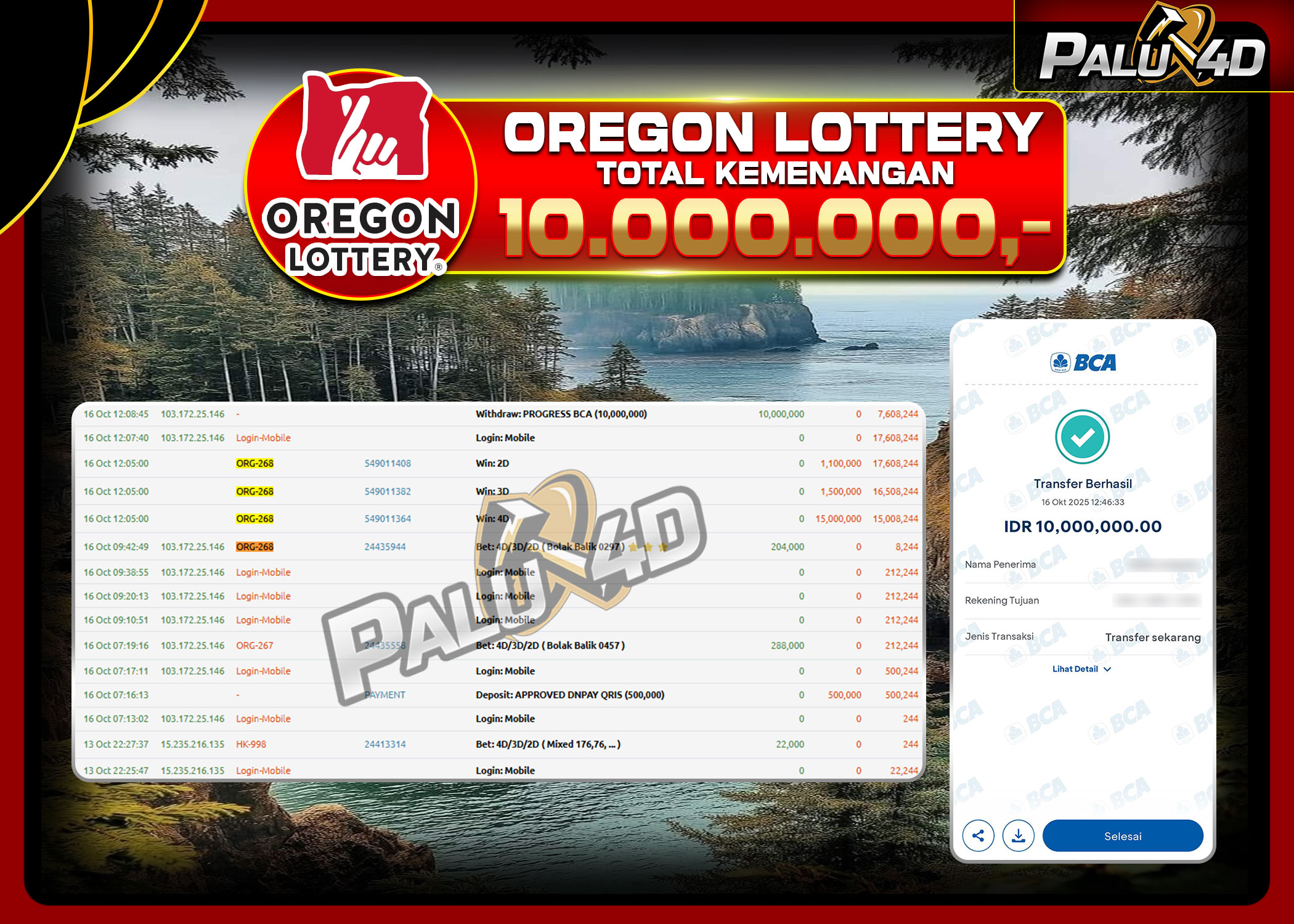 PALU4D – Menang Togel OREGON Rp.10.500.000.,- LUNAS