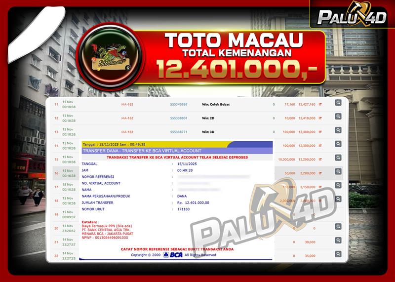 PALU4D – Menang Togel TOTOMACAU Rp.12.401.000.,- LUNAS PALU4D – Selamat bagi pemenang yang mendapatkan jackpot hari ini 15 NOVEMBER 2025 di game […]