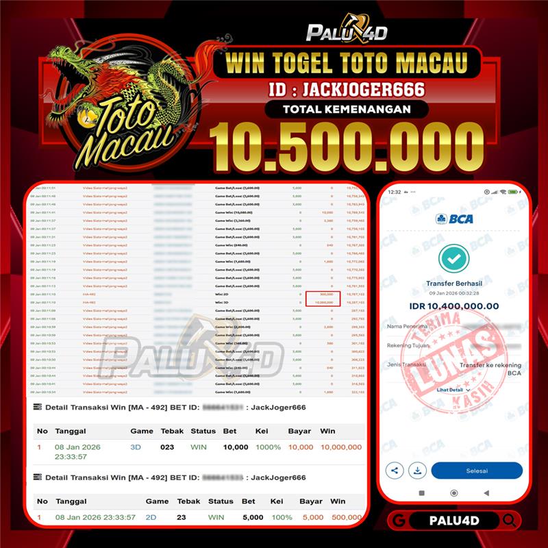 PALU4D – Menang Togel TOTOMACAU Rp.10.500.000.,- LUNAS PALU4D – Selamat bagi pemenang yang mendapatkan jackpot hari ini 09 JANUARI 2026 di game Togel […]