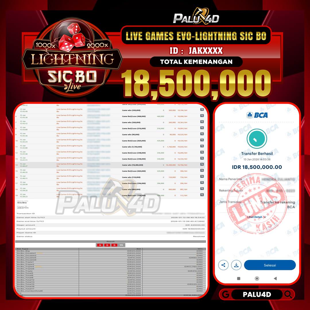 PALU4D – Menang Live Games MEGA SICBO Rp 18.500.000.,- LUNAS