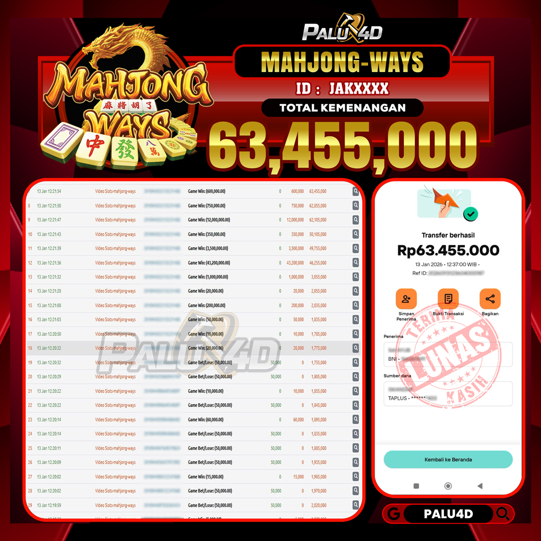 PALU4D – Menang Slot MAHJONG WAYS   Rp.63.455.000.,- LUNAS