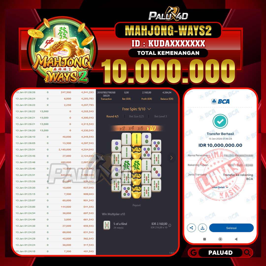 PALU4D – Menang Slot MAHJONG WAYS 2  Rp.10.000.000.,- LUNAS