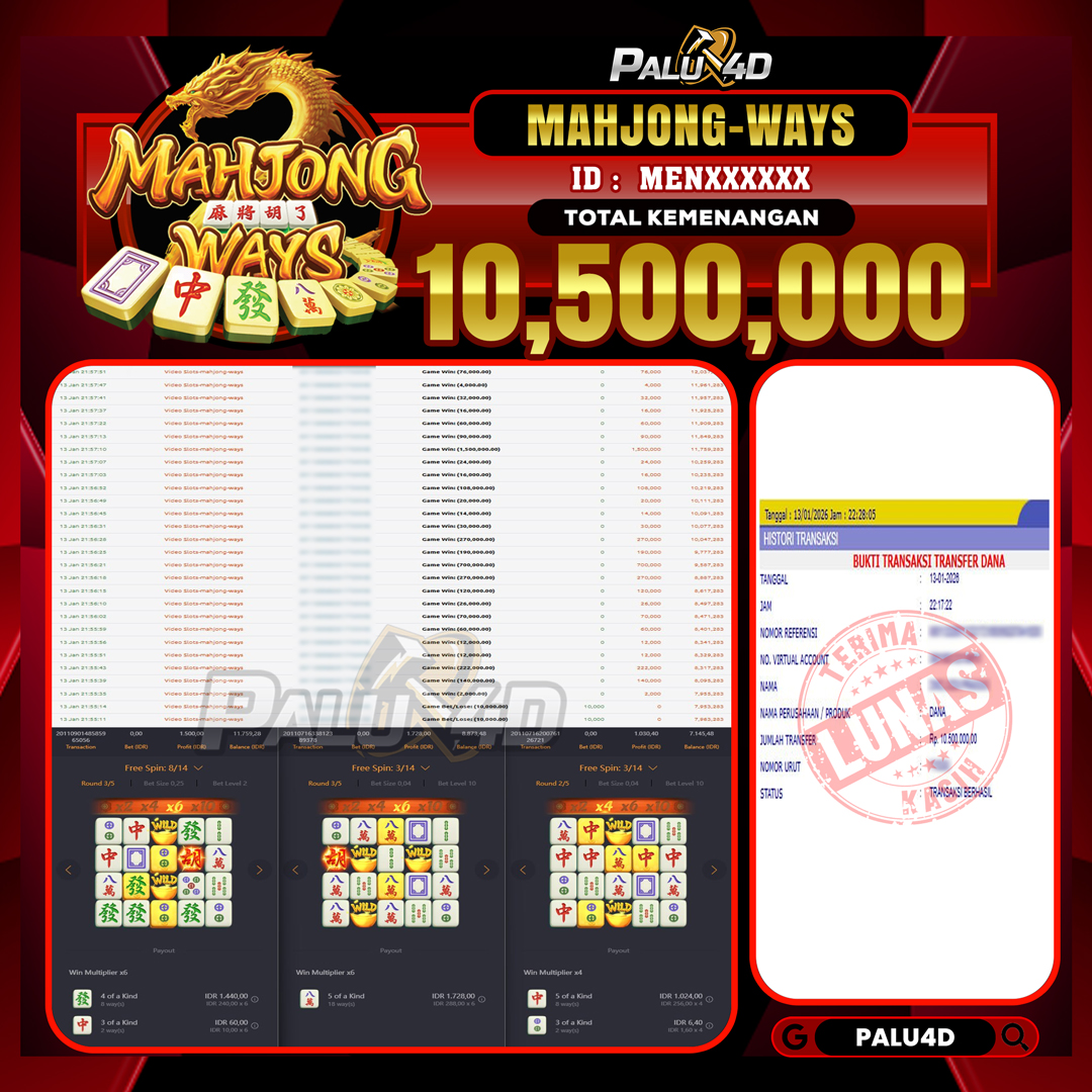 PALU4D – Menang Slot MAHJONG WAYS   Rp.10.500.000.,- LUNAS