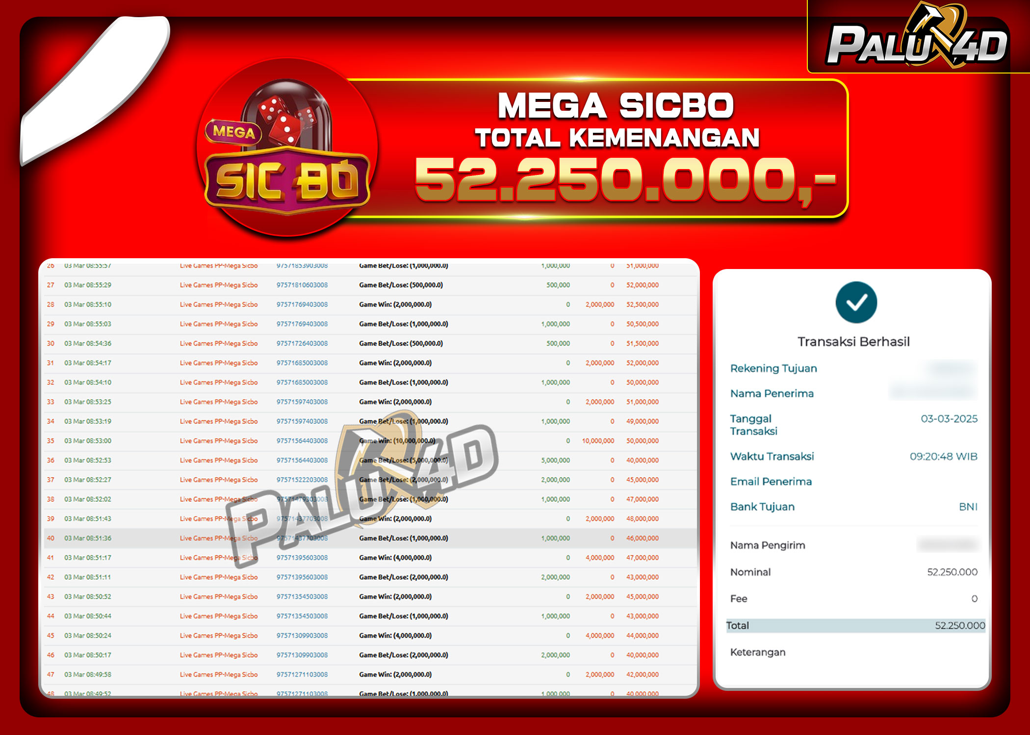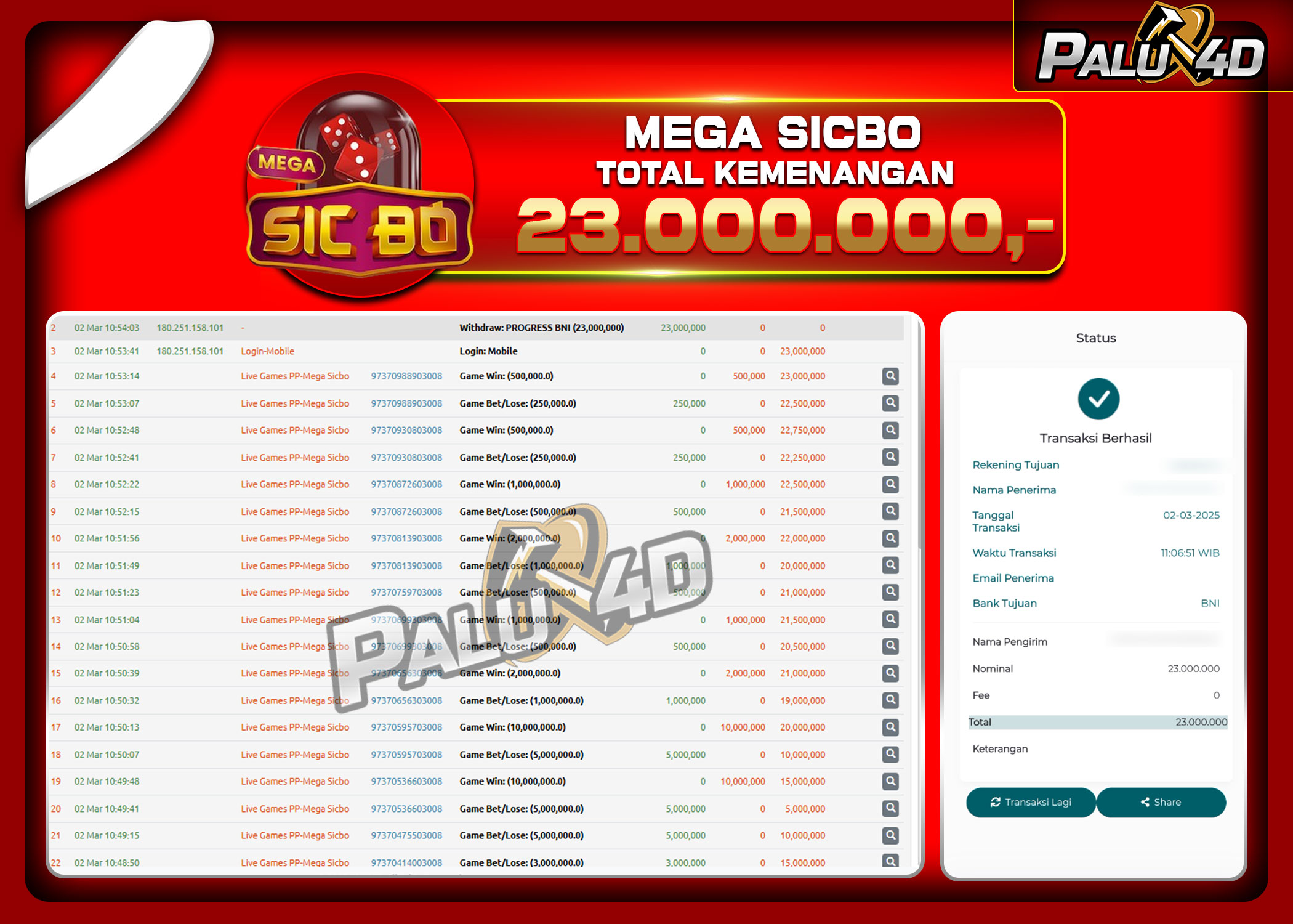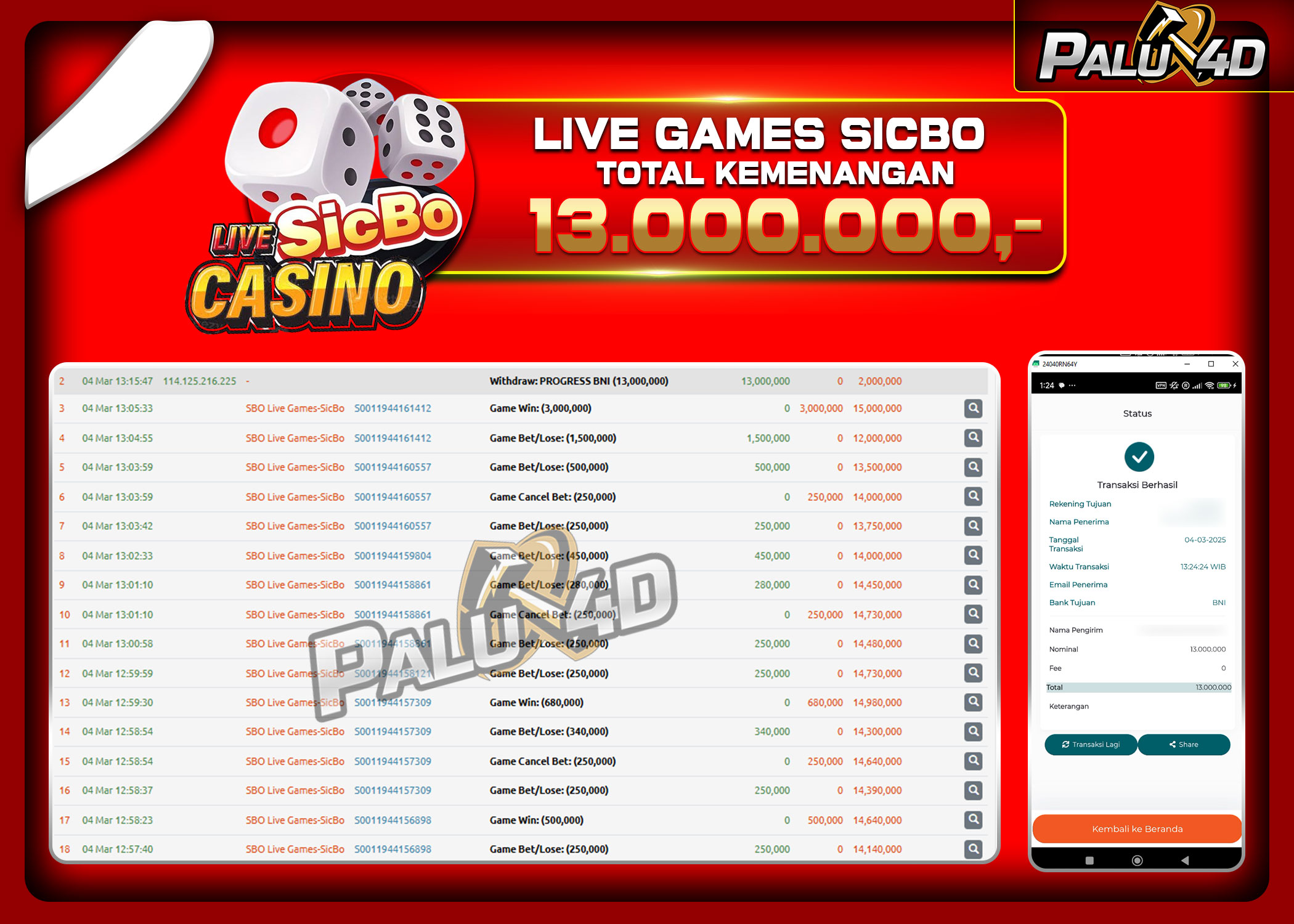 04/03/2025LIVE CASINO PALU4D – Menang Live Games MEGA SICBO Rp 23.000.000.,- LUNAS PALU4D – Menang Live Games MEGA SICBO Rp 23.000.000.,- LUNAS PALU4D – Selamat bagi pemenang yang mendapatkan jackpot hari ini 4 Maret […]