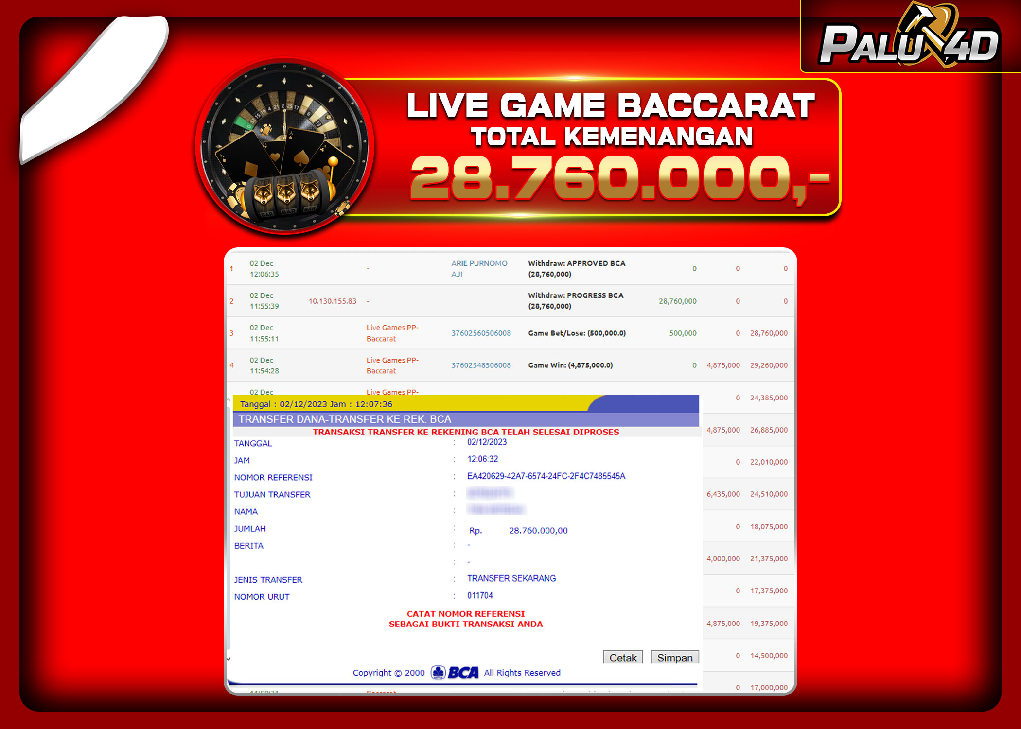PALU4D – Menang Live Games BACCARAT Rp.28.760.000.,- LUNAS