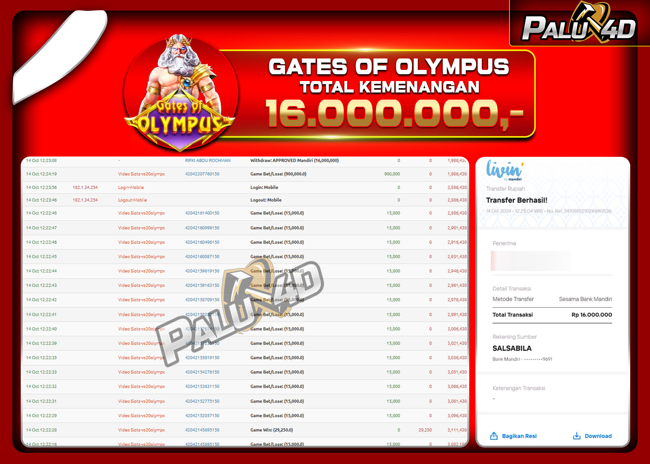 PALU4D – Selamat bagi pemenang yang mendapatkan jackpot hari ini 14 Oktober 2024 di game Slot GATES OF OLYMPUS yang di sediakan situs palu4d dan sudah kami bayar lunas. Berikut data pemenang hari ini yang kami proses dengan cepat ke rekening tujuan yang terdaftar di akun selama ±10 menit.
