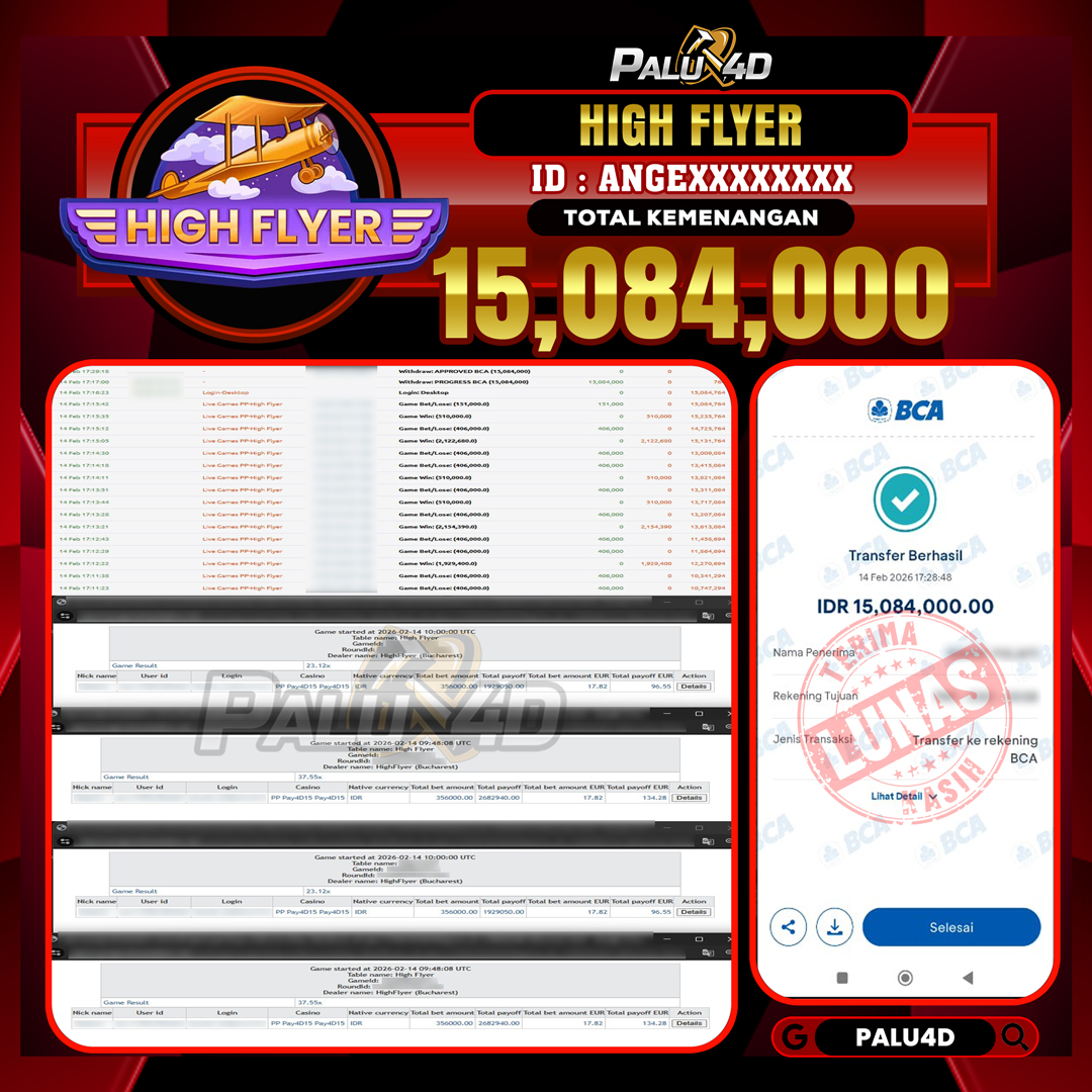 PALU4D – Selamat bagi pemenang yang mendapatkan jackpot hari ini 14 FEBRUARI 2026 di game LIVE CASINO HIGH FLYER yang di sediakan situs palu4d dan sudah kami bayar lunas. Berikut data pemenang hari ini yang kami proses dengan cepat ke rekening tujuan yang terdaftar di akun selama ±10 menit.