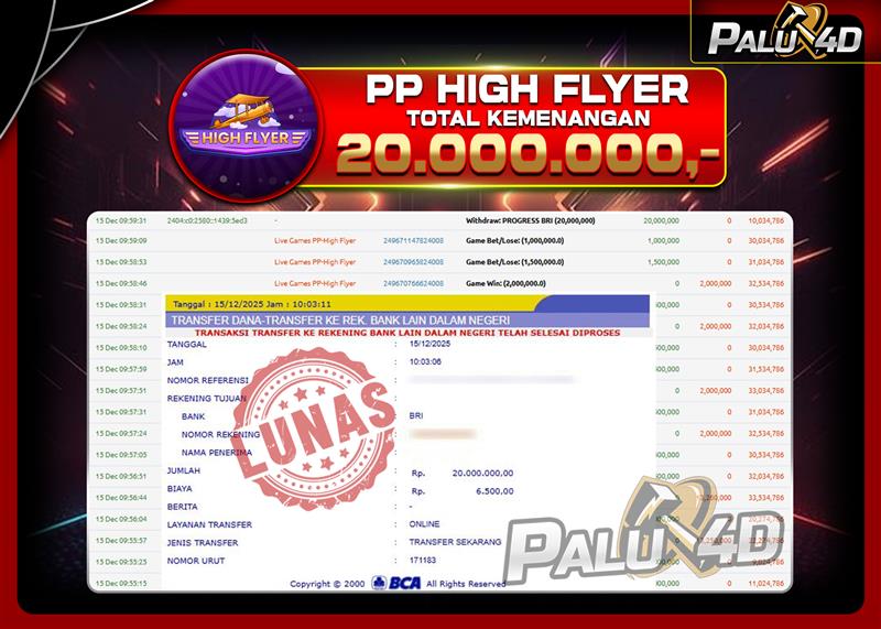 PALU4D – Selamat bagi pemenang yang mendapatkan jackpot hari ini 15 DESEMBER 2025 di game LIVE CASINO HIGH FLYER yang di sediakan situs palu4d dan sudah kami bayar lunas. Berikut data pemenang hari ini yang kami proses dengan cepat ke rekening tujuan yang terdaftar di akun selama ±10 menit.