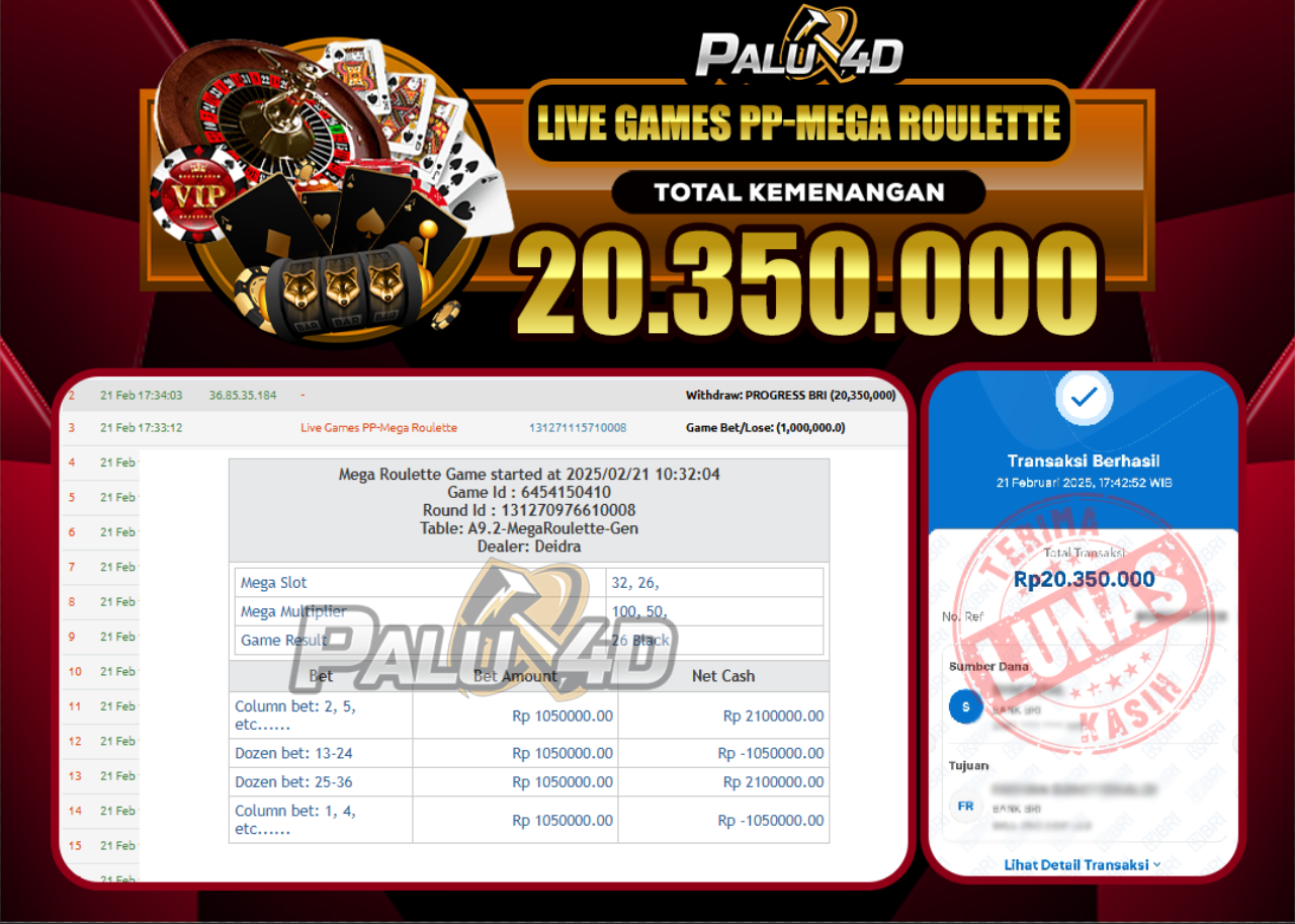 PALU4D – Selamat bagi pemenang yang mendapatkan jackpot hari ini 21 February 2025 di game Slot MEGA ROULETTE yang di sediakan situs palu4d dan sudah kami bayar lunas. Berikut data pemenang hari ini yang kami proses dengan cepat ke rekening tujuan yang terdaftar di akun selama ±10 menit.