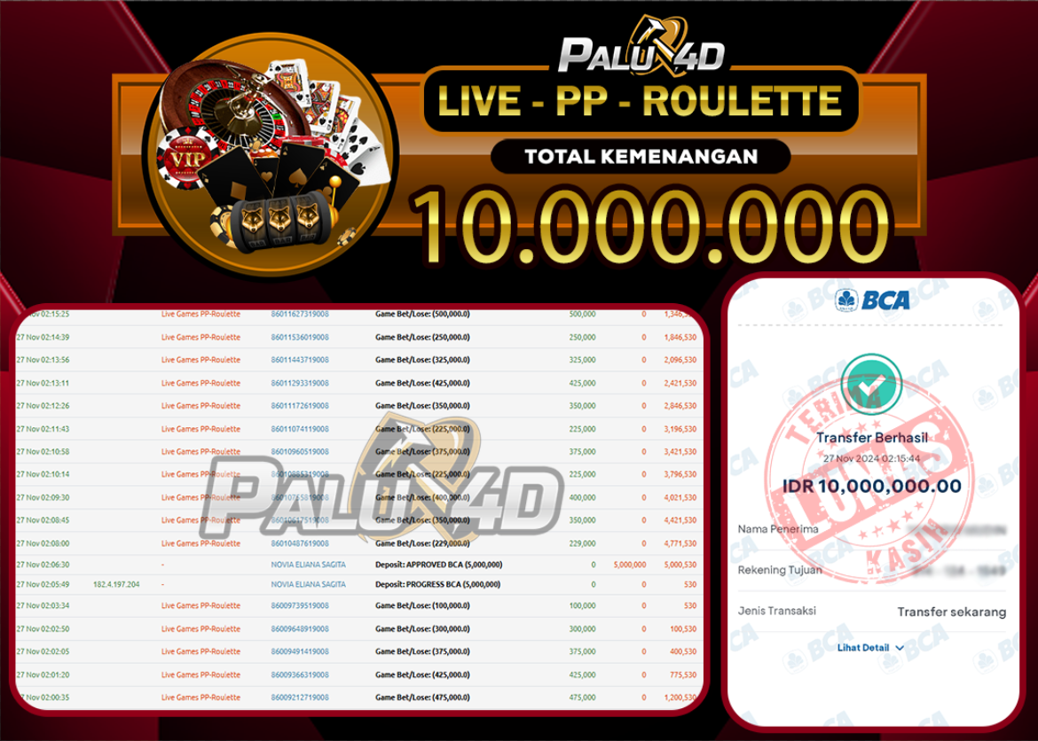 PALU4D – Selamat bagi pemenang yang mendapatkan jackpot hari ini 27 November 2024 di game Slot MEGA ROULETTE   yang di sediakan situs palu4d dan sudah kami bayar lunas. Berikut data pemenang hari ini yang kami proses dengan cepat ke rekening tujuan yang terdaftar di akun selama ±10 menit.