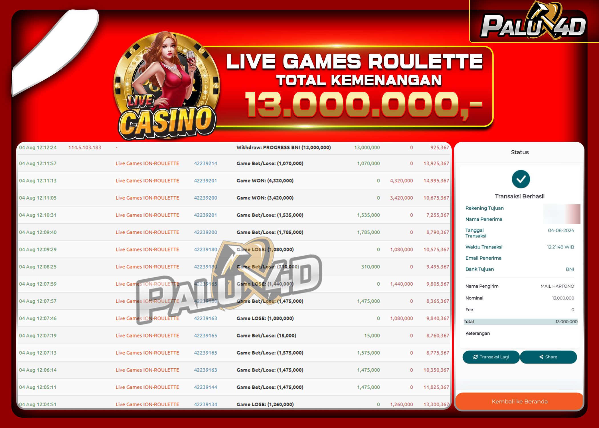 PALU4D – Menang Live Games ROULETTE Rp.13.000.000.,- LUNAS