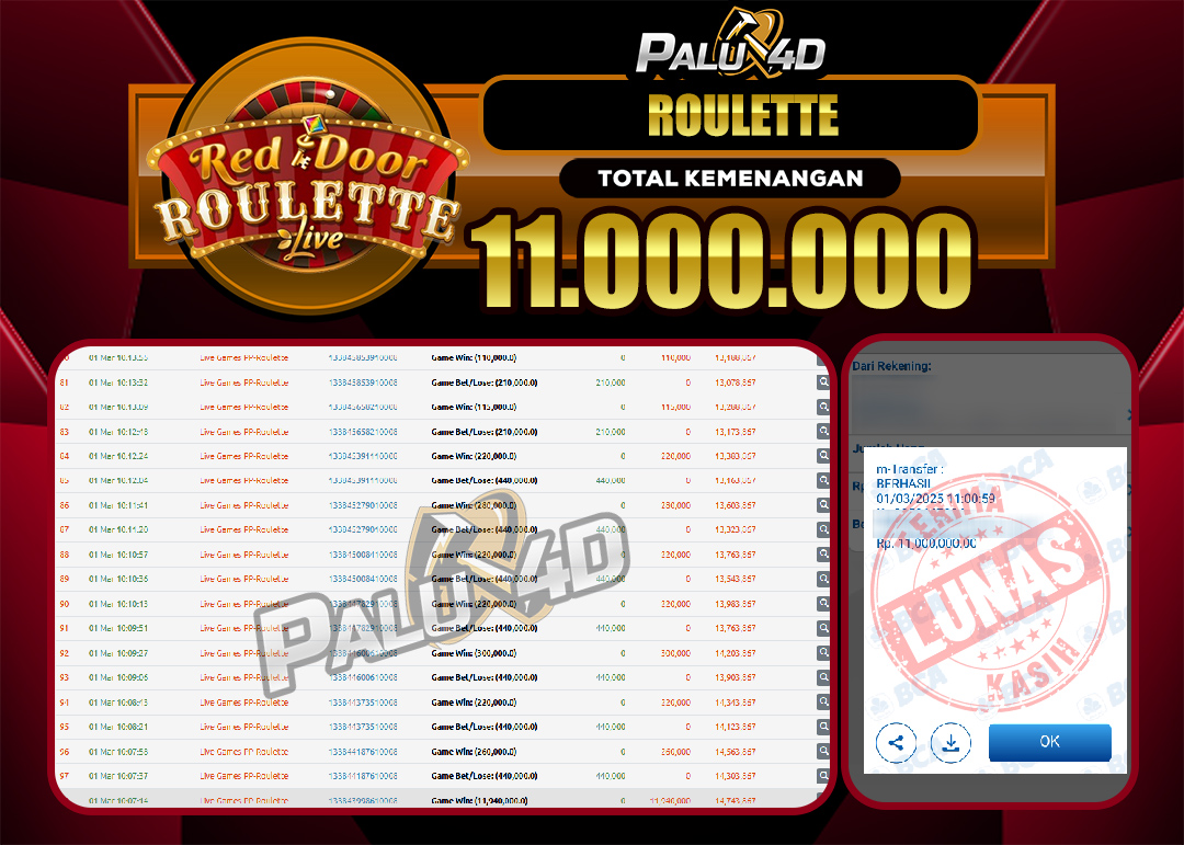 PALU4D – Menang LIVE CASINO MEGA ROULETTE   Rp.11.000.000.,- LUNAS