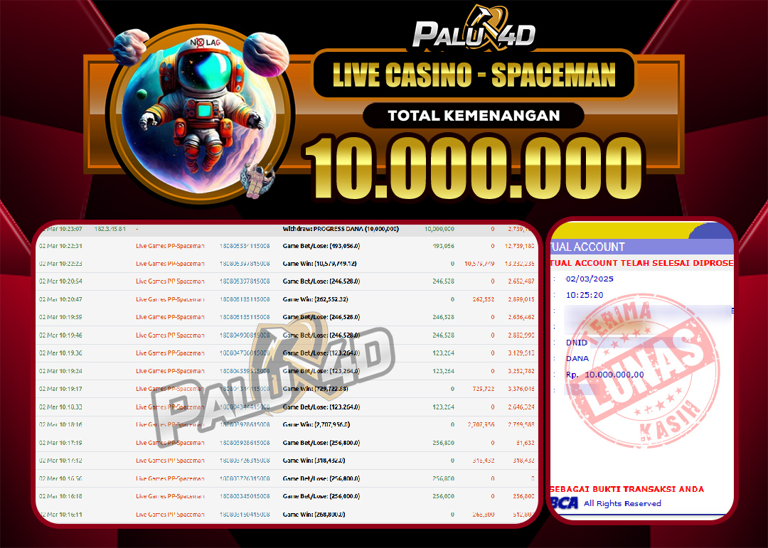 PALU4D – Selamat bagi pemenang yang mendapatkan jackpot hari ini 3 Maret 2025 di game Live Casino SPACEMAN yang di sediakan situs palu4d dan sudah kami bayar lunas. Berikut data pemenang hari ini yang kami proses dengan cepat ke rekening tujuan yang terdaftar di akun selama ±10 menit.
