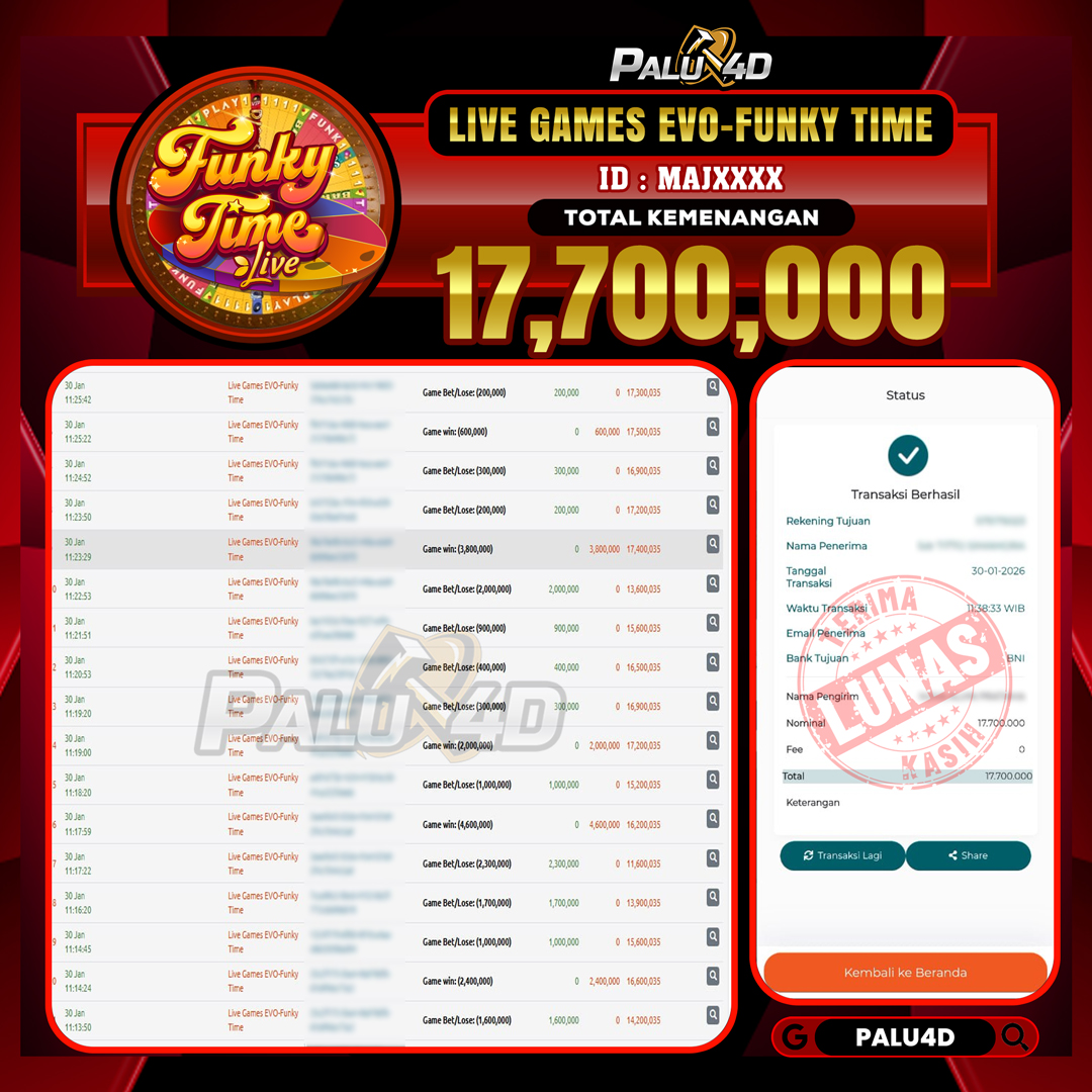 PALU4D – Selamat bagi pemenang yang mendapatkan jackpot hari ini 30 JANUARI 2026 di game Live Games EVO-FUNKY TIME yang di sediakan situs palu4d dan sudah kami bayar lunas. Berikut data pemenang hari ini yang kami proses dengan cepat ke rekening tujuan yang terdaftar di akun selama ±10 menit.