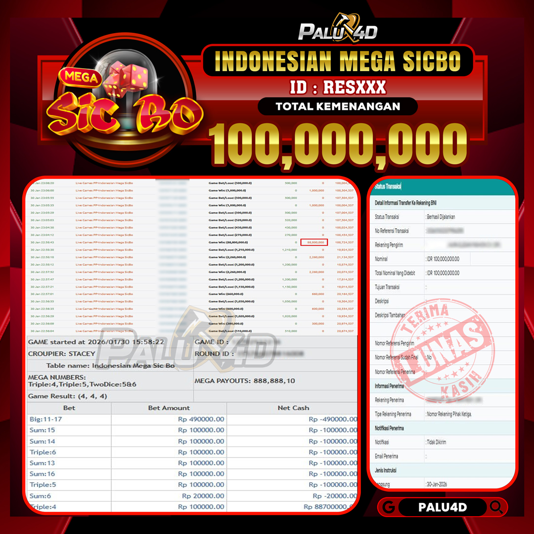 PALU4D – Selamat bagi pemenang yang mendapatkan jackpot hari ini 30 JANUARI 2026 di game Live Games INDONESIAN MEGA SICBO yang di sediakan situs palu4d dan sudah kami bayar lunas. Berikut data pemenang hari ini yang kami proses dengan cepat ke rekening tujuan yang terdaftar di akun selama ±10 menit.
