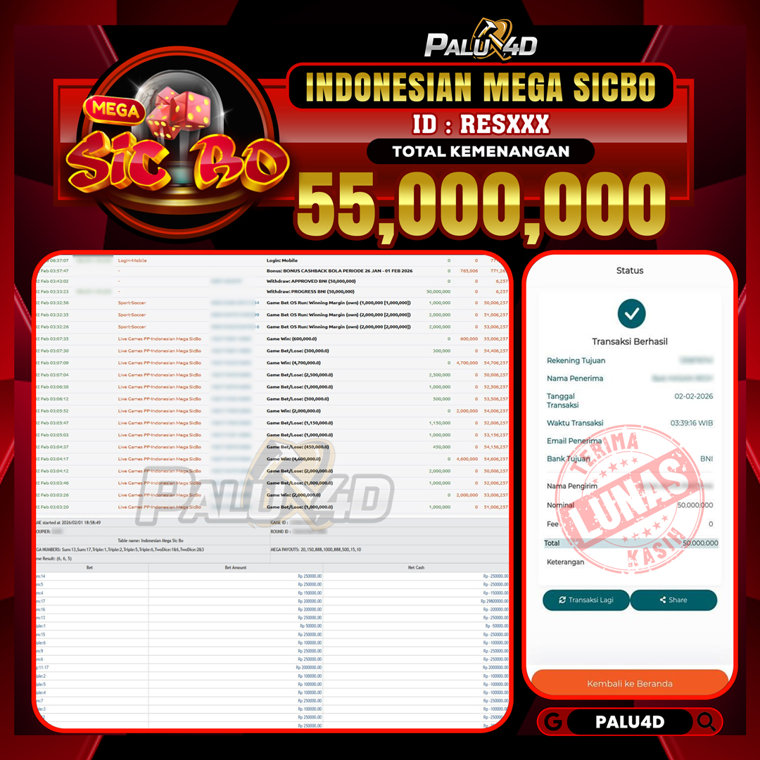 PALU4D – Menang Live Games INDONESIAN MEGA SICBO Rp.55.000.000.,- LUNAS