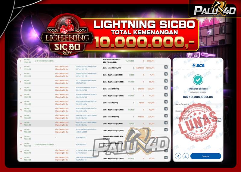 PALU4D – Menang Live Games LIGHTNING SICBO Rp 10.000.000.,- LUNAS