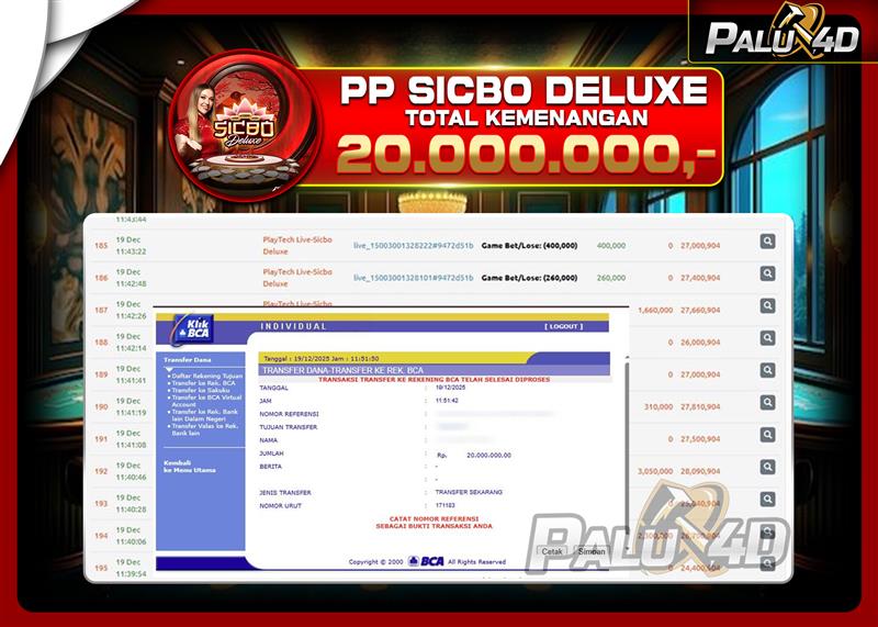 PALU4D – Selamat bagi pemenang yang mendapatkan jackpot hari ini 19 DESEMBER 2025 di game Live Games MEGA SICBO yang di sediakan situs palu4d dan sudah kami bayar lunas. Berikut data pemenang hari ini yang kami proses dengan cepat ke rekening tujuan yang terdaftar di akun selama ±10 menit.