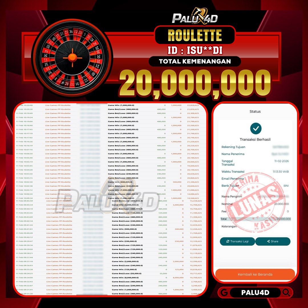 PALU4D – Selamat bagi pemenang yang mendapatkan jackpot hari ini 11 FEBRUARI 2026 di game Live Games ROULETTE yang di sediakan situs palu4d dan sudah kami bayar lunas. Berikut data pemenang hari ini yang kami proses dengan cepat ke rekening tujuan yang terdaftar di akun selama ±10 menit.