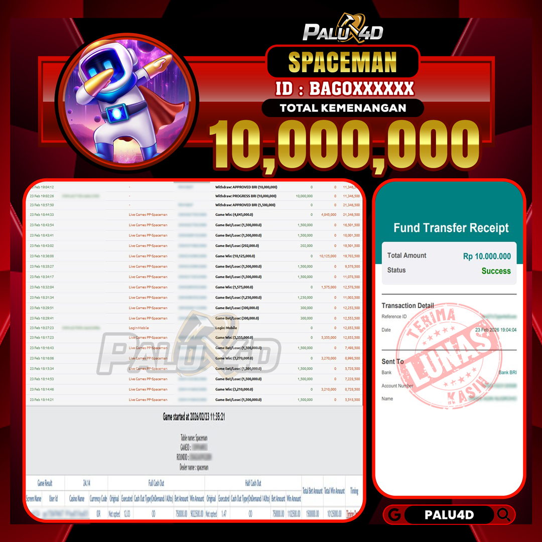 PALU4D – Selamat bagi pemenang yang mendapatkan jackpot hari ini 23 FEBRUARI 2026 di game Live Games SPACEMAN yang di sediakan situs palu4d dan sudah kami bayar lunas. Berikut data pemenang hari ini yang kami proses dengan cepat ke rekening tujuan yang terdaftar di akun selama ±10 menit.
