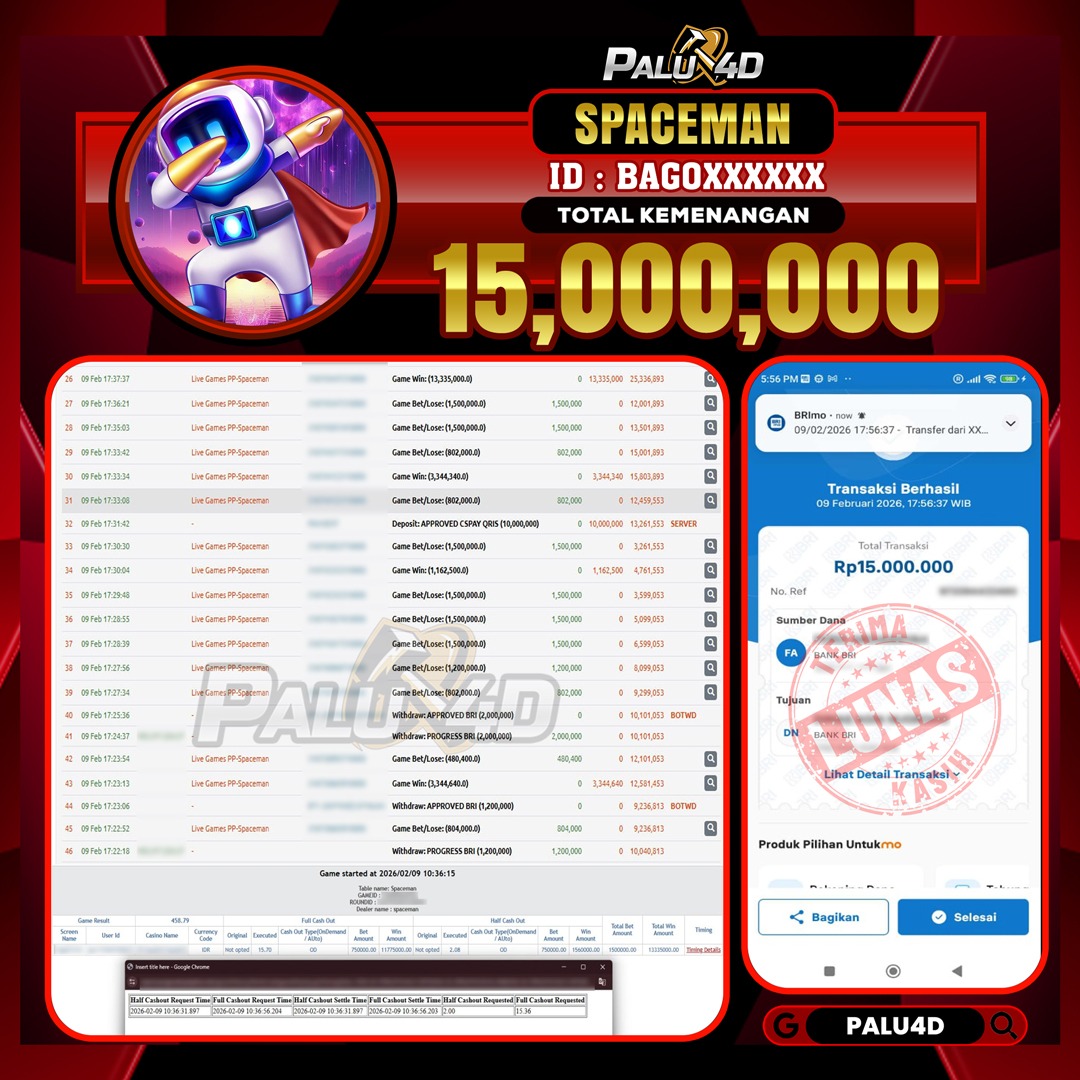 PALU4D – Selamat bagi pemenang yang mendapatkan jackpot hari ini 09 FEBRUARI 2026 di game Live Games SPACEMAN yang di sediakan situs palu4d dan sudah kami bayar lunas. Berikut data pemenang hari ini yang kami proses dengan cepat ke rekening tujuan yang terdaftar di akun selama ±10 menit.