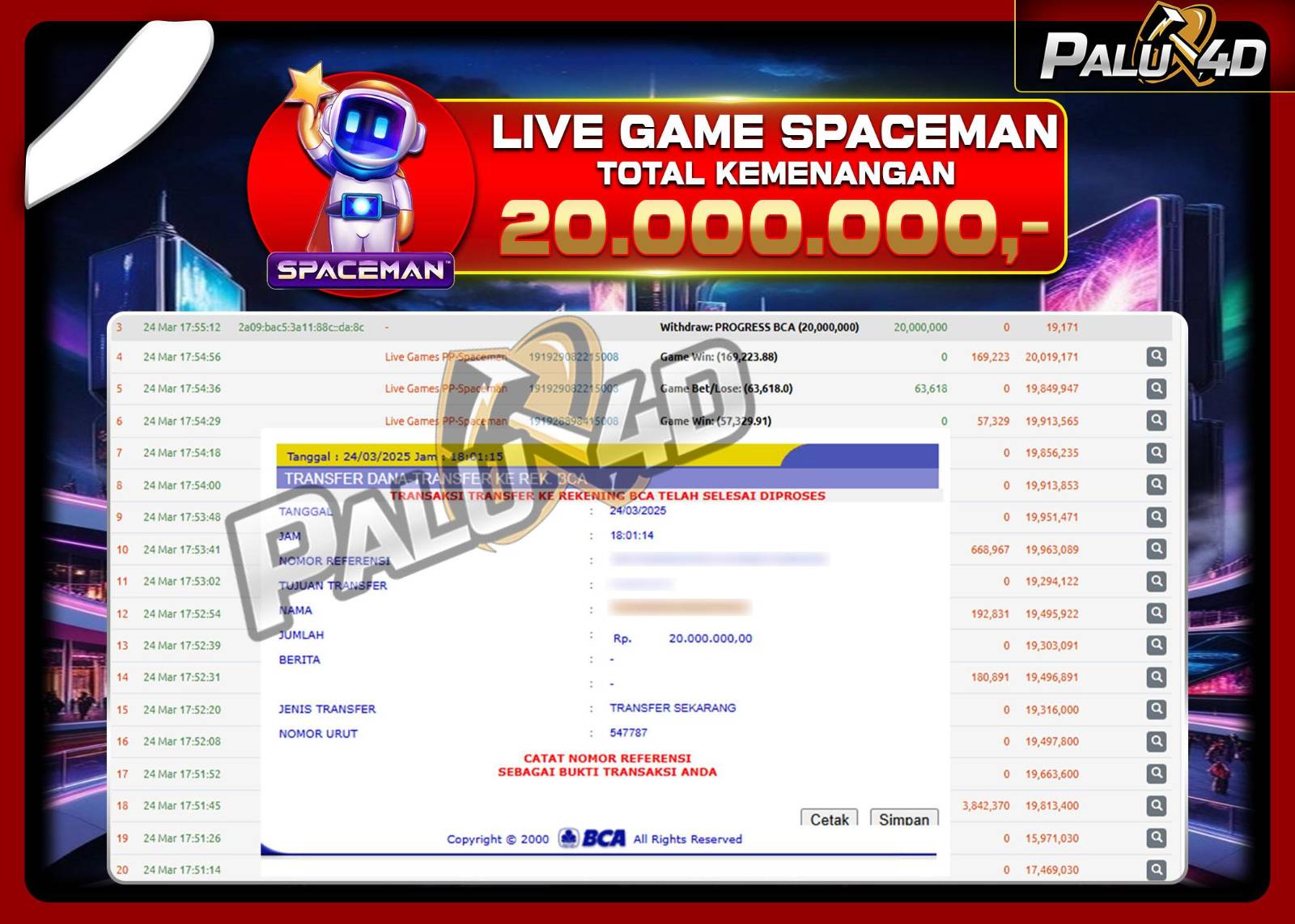 PALU4D – Menang Live Games SPACEMAN Rp 20.000.000.,- LUNAS