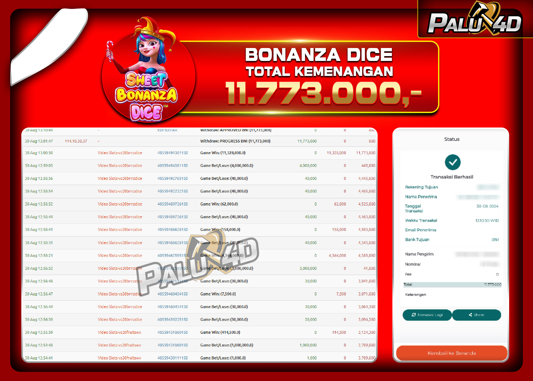 PALU4D – Selamat bagi pemenang yang mendapatkan jackpot hari ini 30 AGUSTUS 2024 di game Slot SWEET BONANZA DICE   yang di sediakan situs palu4d dan sudah kami bayar lunas. Berikut data pemenang hari ini yang kami proses dengan cepat ke rekening tujuan yang terdaftar di akun selama ±10 menit.