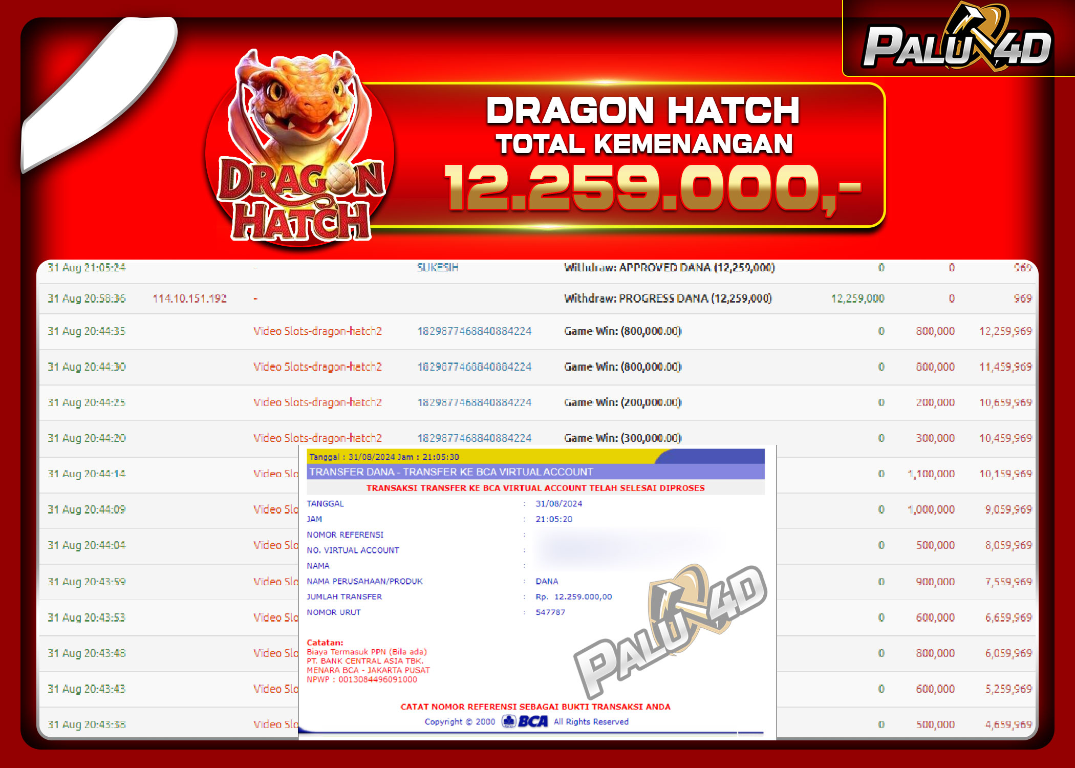 PALU4D – Selamat bagi pemenang yang mendapatkan jackpot hari ini 31 Agustus 2024 di game Slot DRAGON HATCH  yang di sediakan situs palu4d dan sudah kami bayar lunas. Berikut data pemenang hari ini yang kami proses dengan cepat ke rekening tujuan yang terdaftar di akun selama ±10 menit.