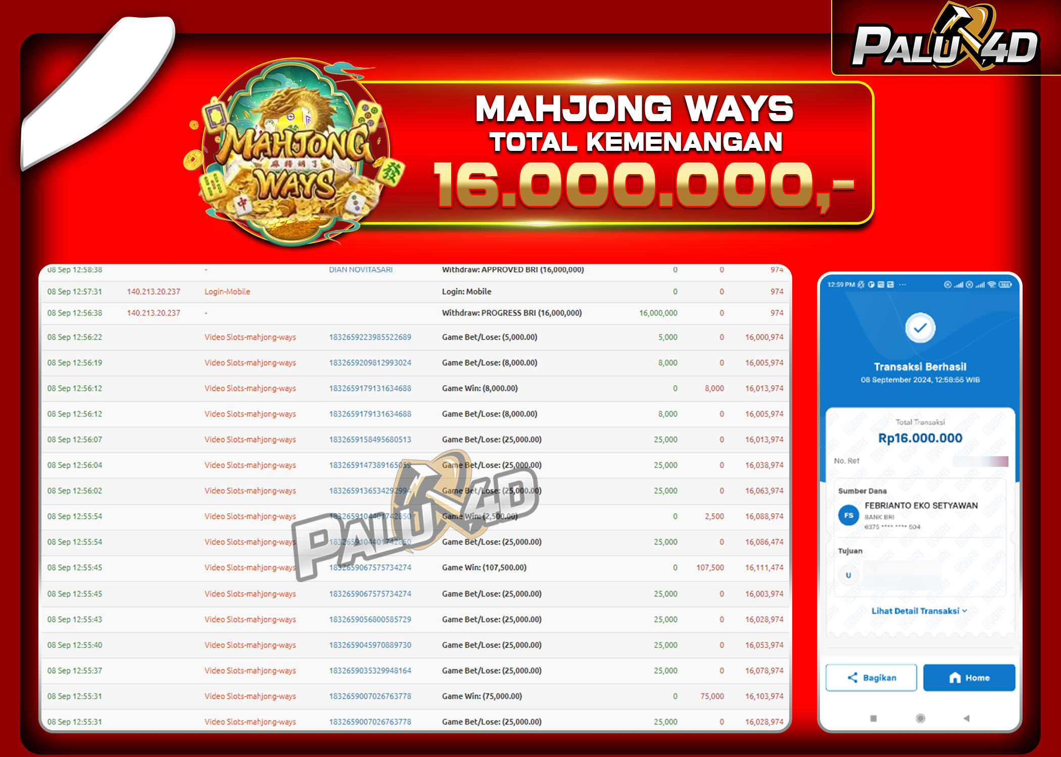 PALU4D – Menang Slot MAHJONG WAYS Rp.16.000.000.,- LUNAS