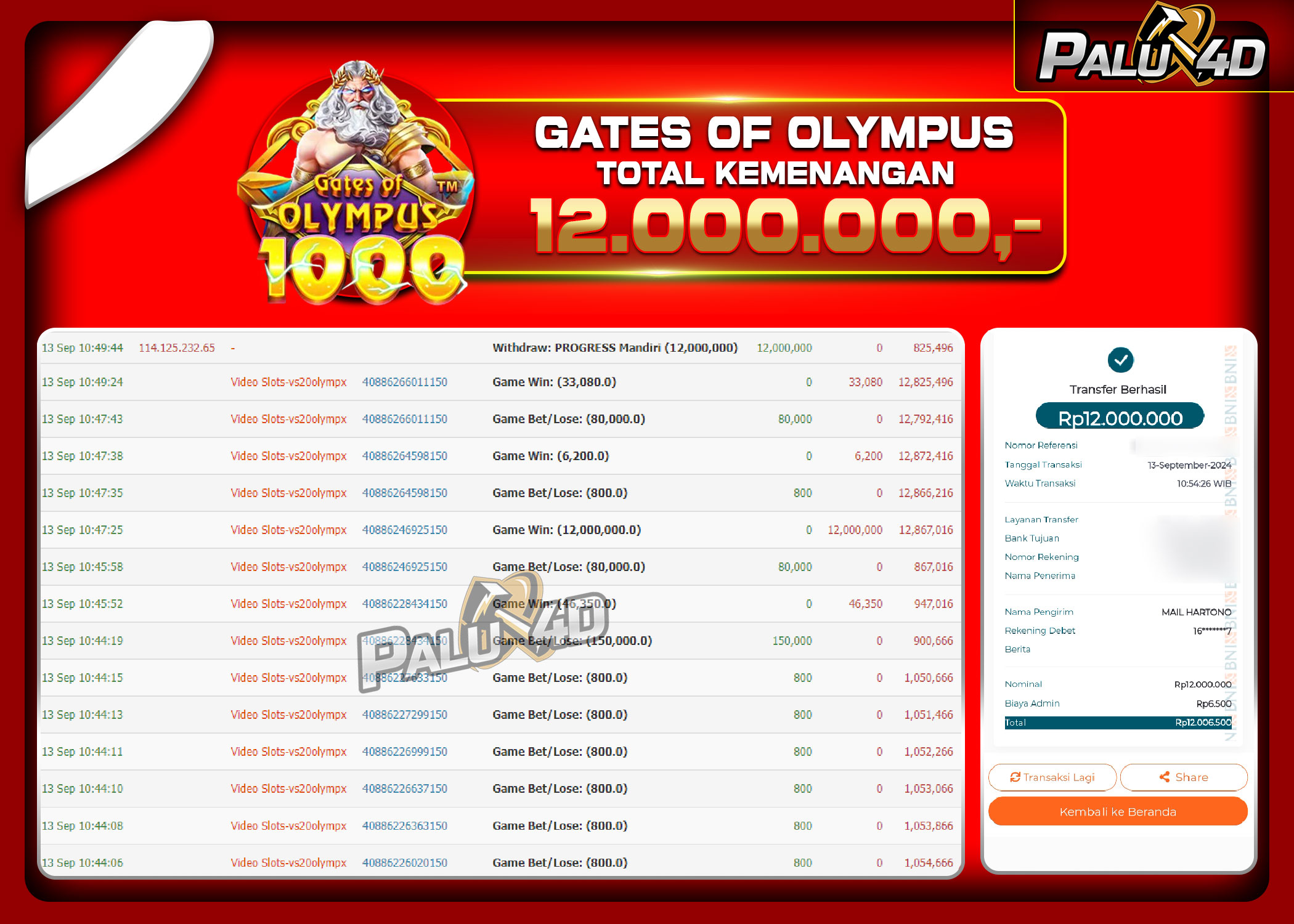 PALU4D – Selamat bagi pemenang yang mendapatkan jackpot hari ini 13 September 2024 di game Slot GATES OF OLYMPUS yang di sediakan situs palu4d dan sudah kami bayar lunas. Berikut data pemenang hari ini yang kami proses dengan cepat ke rekening tujuan yang terdaftar di akun selama ±10 menit.