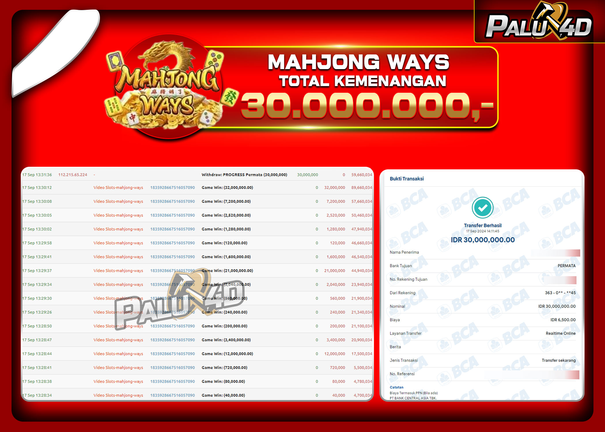 PALU4D – Menang Slot MAHJONG WAYS Rp.30.000.000.,- LUNAS