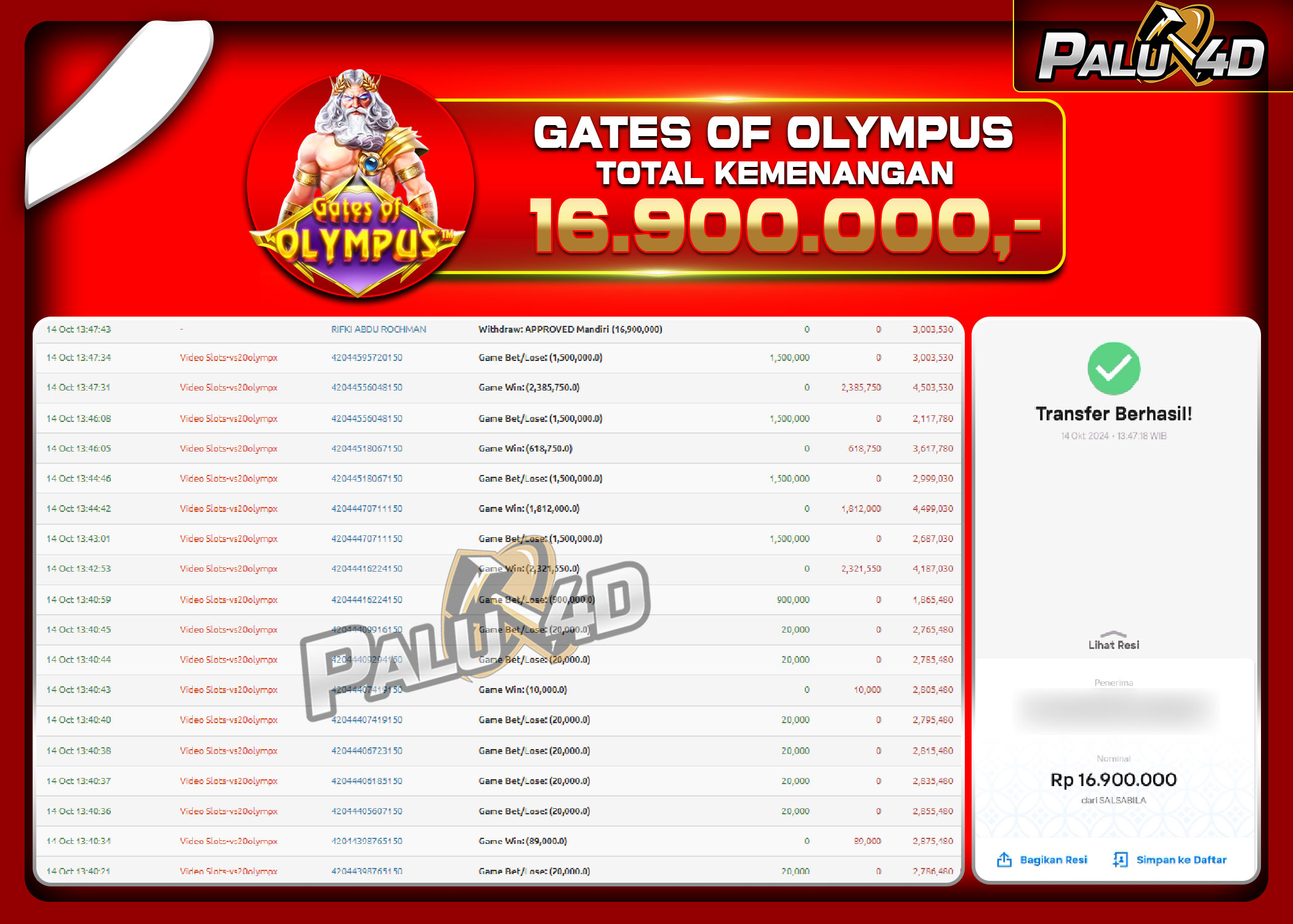 PALU4D – Selamat bagi pemenang yang mendapatkan jackpot hari ini 14 Oktober 2024 di game Slot GATES OF OLYMPUS yang di sediakan situs palu4d dan sudah kami bayar lunas. Berikut data pemenang hari ini yang kami proses dengan cepat ke rekening tujuan yang terdaftar di akun selama ±10 menit.