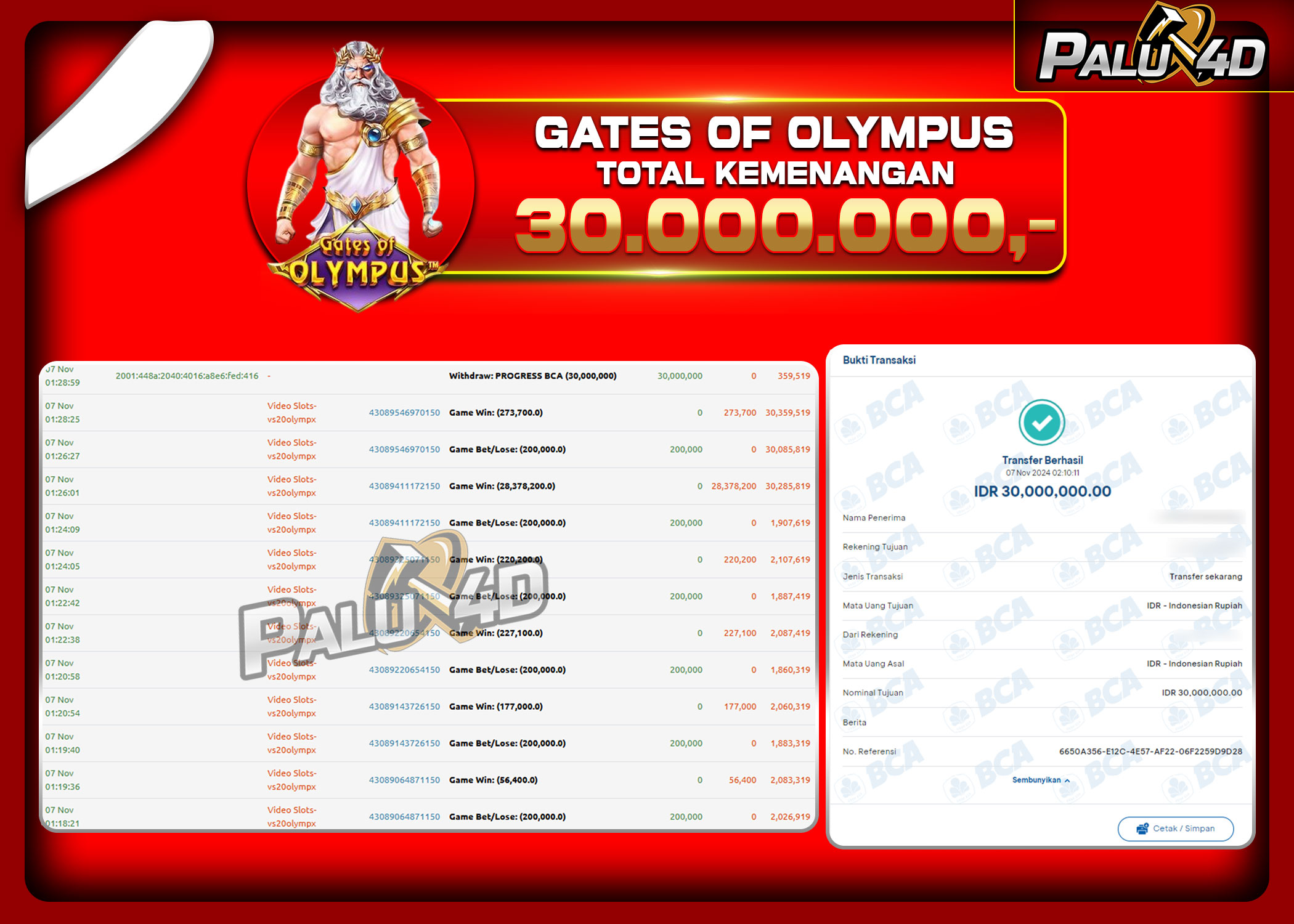 PALU4D – Selamat bagi pemenang yang mendapatkan jackpot hari ini 7 November 2024 di game Slot GATES OF OLYMPUS yang di sediakan situs palu4d dan sudah kami bayar lunas. Berikut data pemenang hari ini yang kami proses dengan cepat ke rekening tujuan yang terdaftar di akun selama ±10 menit.