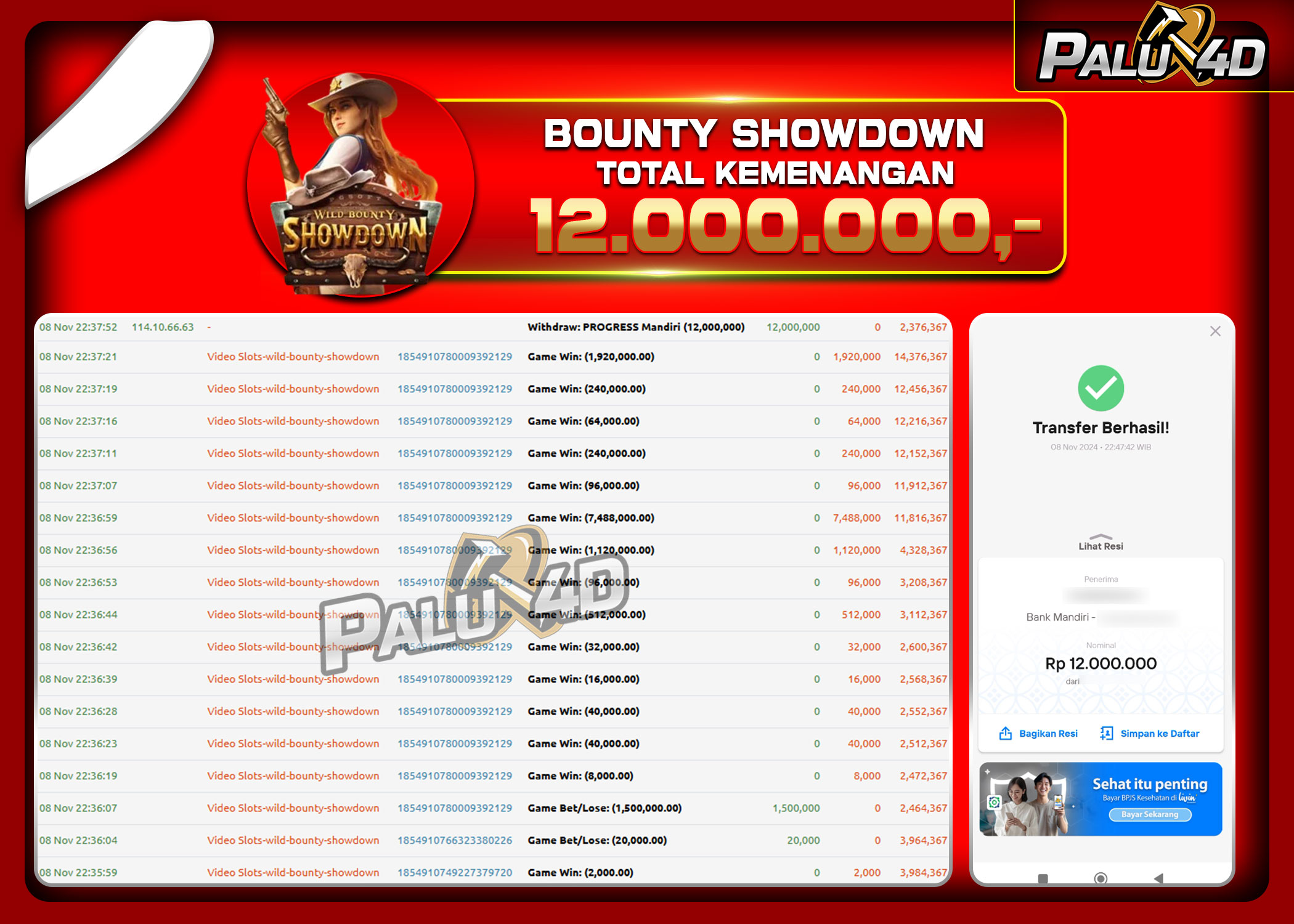 PALU4D – Selamat bagi pemenang yang mendapatkan jackpot hari ini 8 November 2024 di game Slot WILD BOUNTY SHOWDOWN yang di sediakan situs palu4d dan sudah kami bayar lunas. Berikut data pemenang hari ini yang kami proses dengan cepat ke rekening tujuan yang terdaftar di akun selama ±10 menit.
