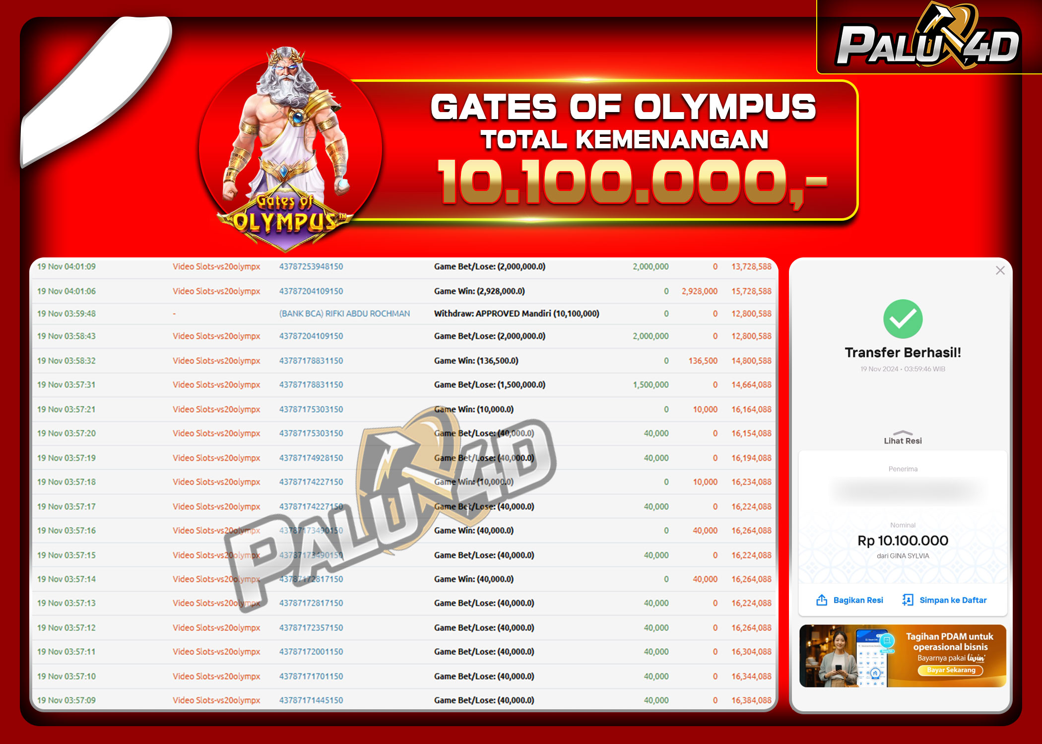 PALU4D – Selamat bagi pemenang yang mendapatkan jackpot hari ini 19 November 2024 di game Slot GATES OF OLYMPUS yang di sediakan situs palu4d dan sudah kami bayar lunas. Berikut data pemenang hari ini yang kami proses dengan cepat ke rekening tujuan yang terdaftar di akun selama ±10 menit.