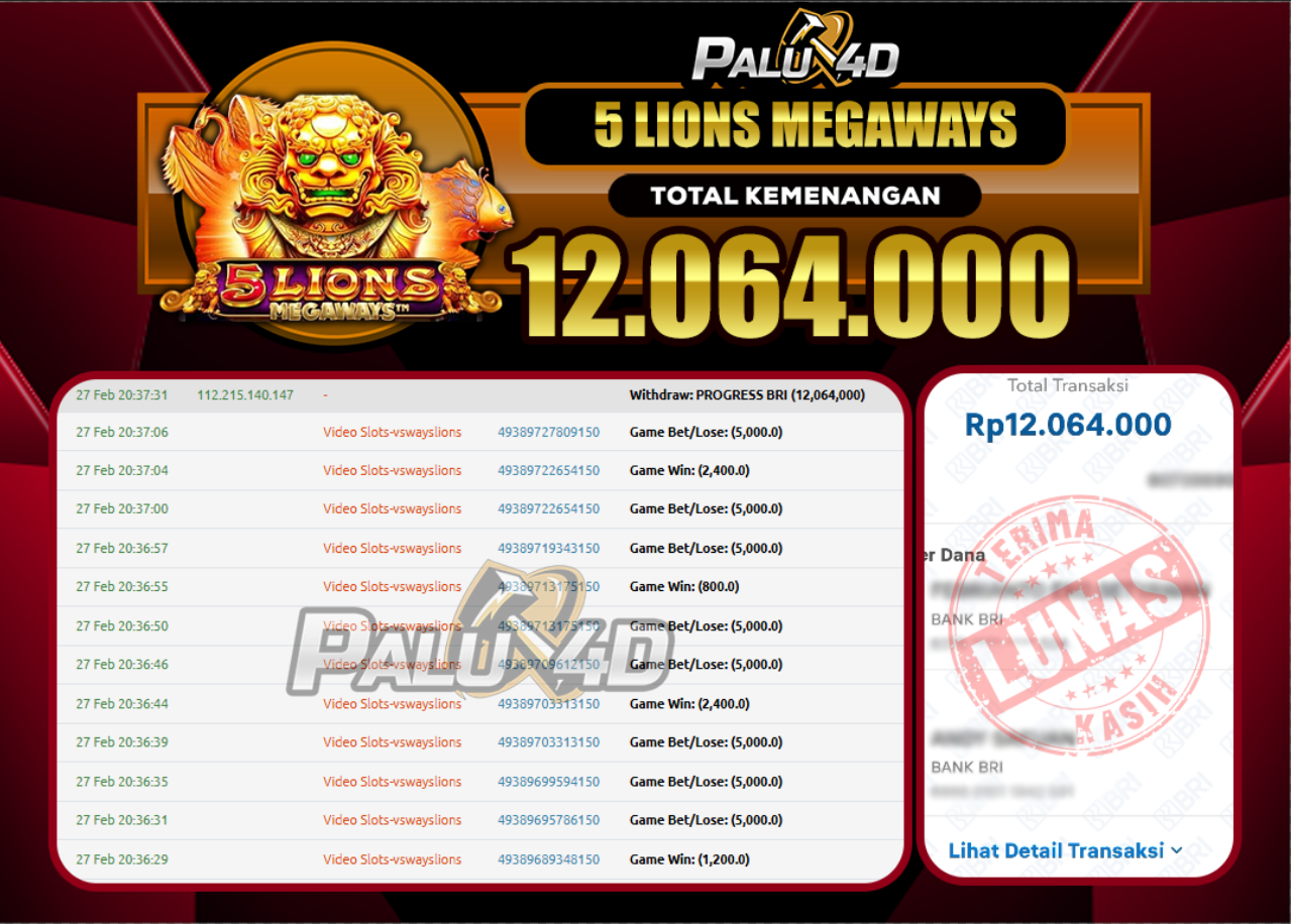 PALU4D – Menang Slot 5 LIONS MEGAWAYSRp.12.064.000.,- LUNAS