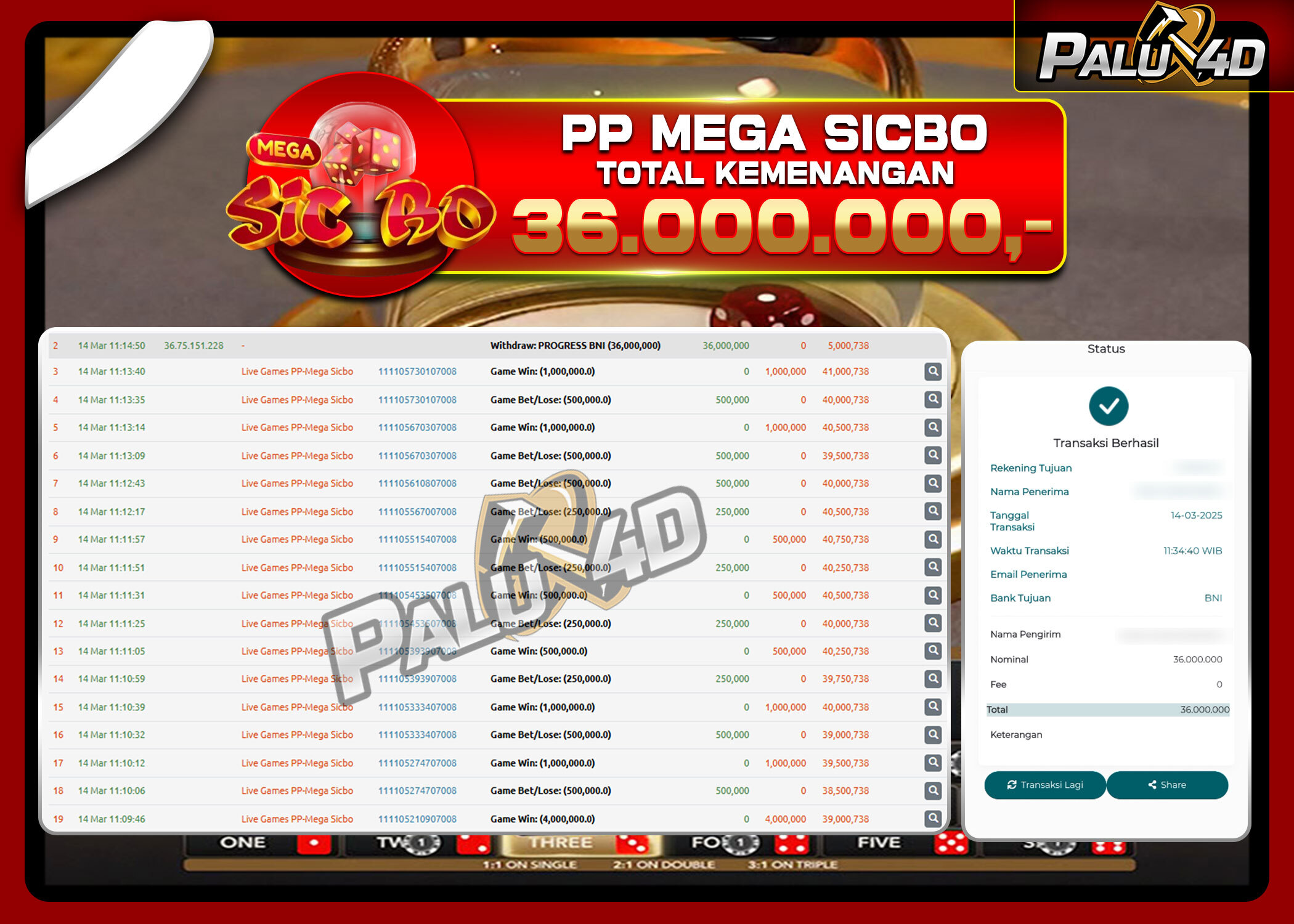 PALU4D – Menang Live Games MEGA SICBO Rp 36.000.000.,- LUNAS