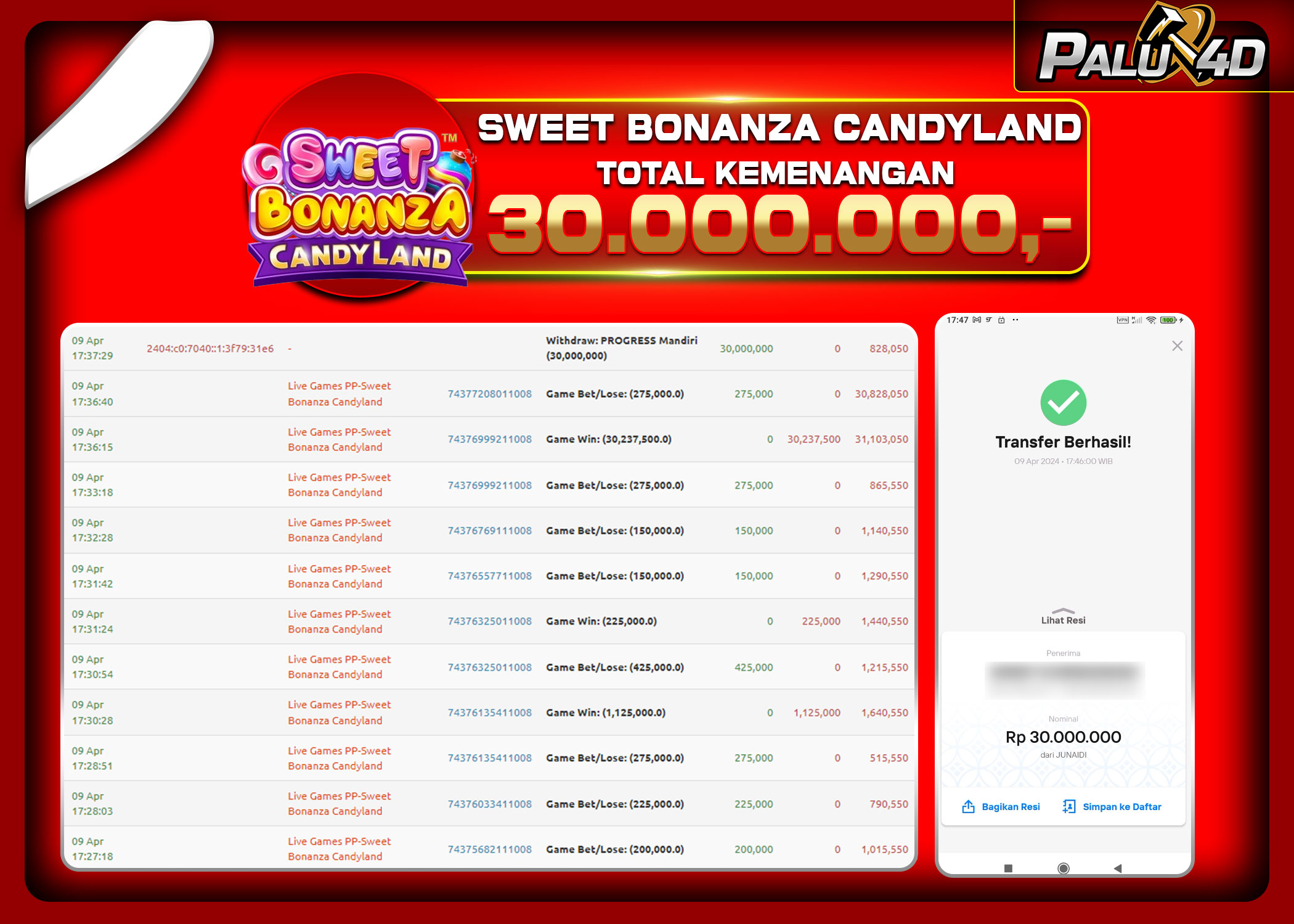 PALU4D – Menang LIVE CASINO SWEET BONANZA CANDYLAND   Rp.30.000.000.,- LUNAS