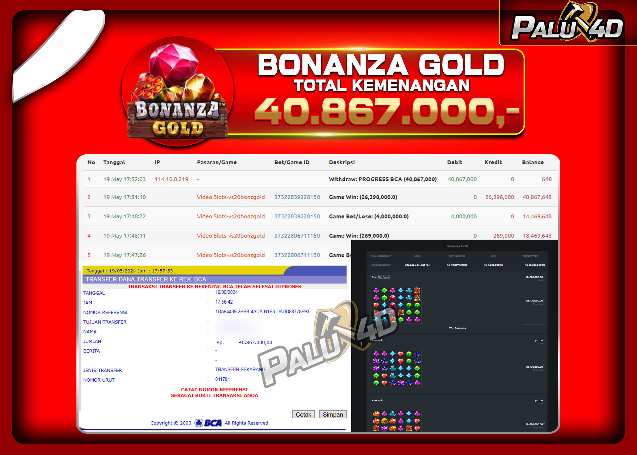 PALU4D – Selamat bagi pemenang yang mendapatkan jackpot hari ini 19 May 2024 di game Slot BONANZA GOLD  yang di sediakan situs palu4d dan sudah kami bayar lunas. Berikut data pemenang hari ini yang kami proses dengan cepat ke rekening tujuan yang terdaftar di akun selama ±10 menit.