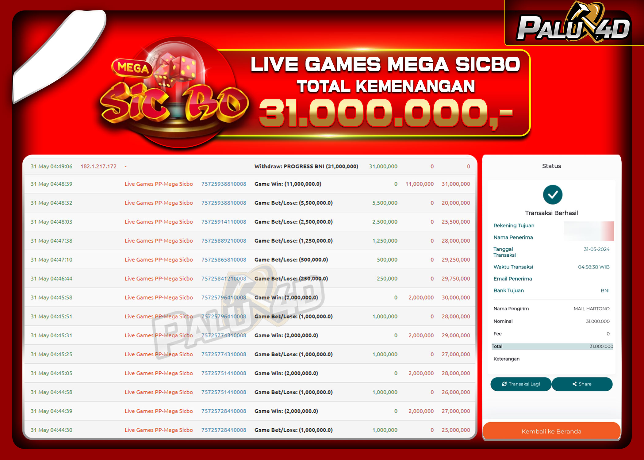 PALU4D – Menang Live Games MEGA SICBO Rp31.000.000.,- LUNAS