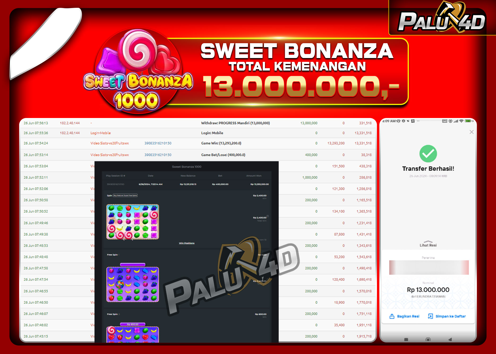 PALU4D – Selamat bagi pemenang yang mendapatkan jackpot hari ini 26 Juni 2024 di game Slot SWEET BONANZA yang di sediakan situs palu4d dan sudah kami bayar lunas. Berikut data pemenang hari ini yang kami proses dengan cepat ke rekening tujuan yang terdaftar di akun selama ±10 menit.