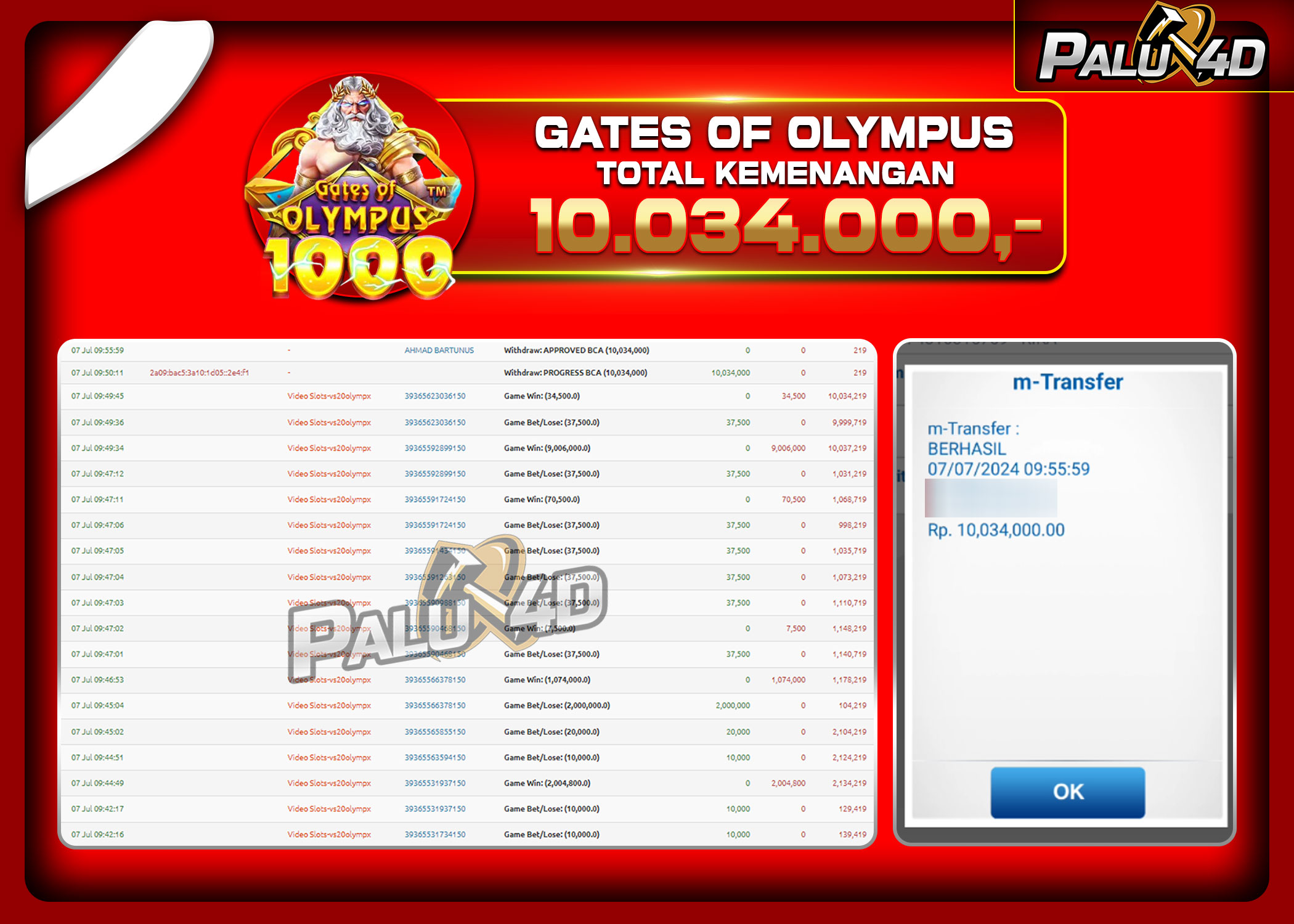 PALU4D – Selamat bagi pemenang yang mendapatkan jackpot hari ini 7 July 2024 di game Slot GATES OF OLYMPUS yang di sediakan situs palu4d dan sudah kami bayar lunas. Berikut data pemenang hari ini yang kami proses dengan cepat ke rekening tujuan yang terdaftar di akun selama ±10 menit.