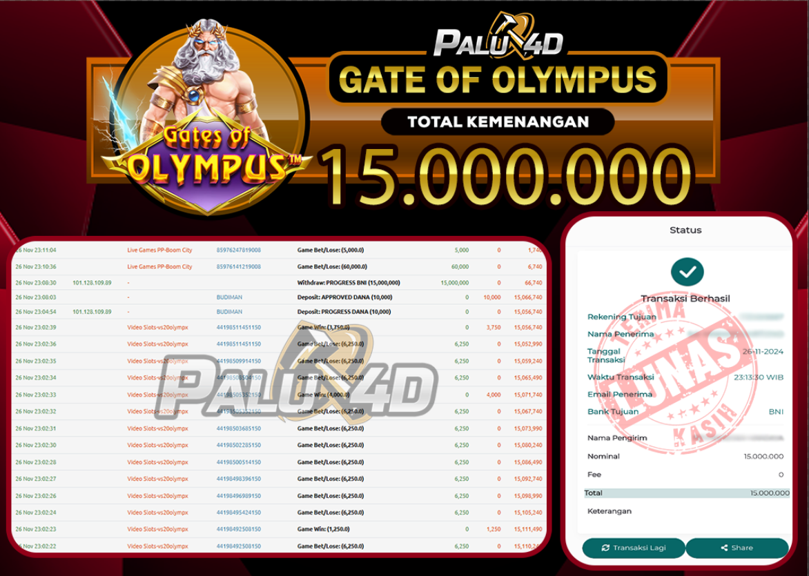 PALU4D – Selamat bagi pemenang yang mendapatkan jackpot hari ini 26 November 2024 di game Slot GATE OF OLYMPUS yang di sediakan situs palu4d dan sudah kami bayar lunas. Berikut data pemenang hari ini yang kami proses dengan cepat ke rekening tujuan yang terdaftar di akun selama ±10 menit.