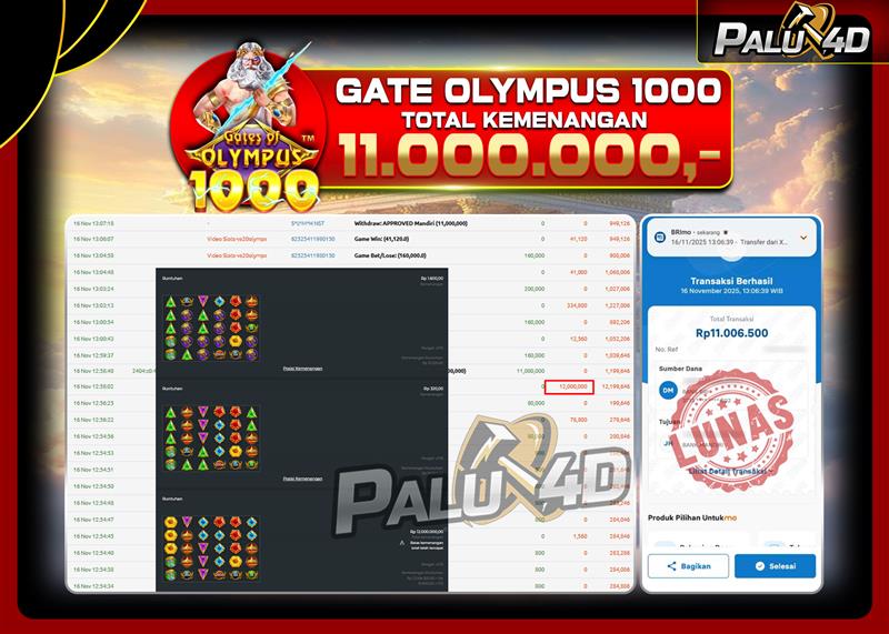 PALU4D – Selamat bagi pemenang yang mendapatkan jackpot hari ini 16 NOVEMBER 2025 di game Slot GATES OF OLYMPUS 1000 yang di sediakan situs palu4d dan sudah kami bayar lunas. Berikut data pemenang hari ini yang kami proses dengan cepat ke rekening tujuan yang terdaftar di akun selama ±10 menit.
