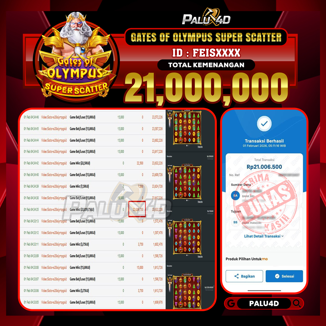 PALU4D – Selamat bagi pemenang yang mendapatkan jackpot hari ini 01 FEBRUARI 2026 di game Slot GATES OF OLYMPUS SUPER SCATTER yang di sediakan situs palu4d dan sudah kami bayar lunas. Berikut data pemenang hari ini yang kami proses dengan cepat ke rekening tujuan yang terdaftar di akun selama ±10 menit.