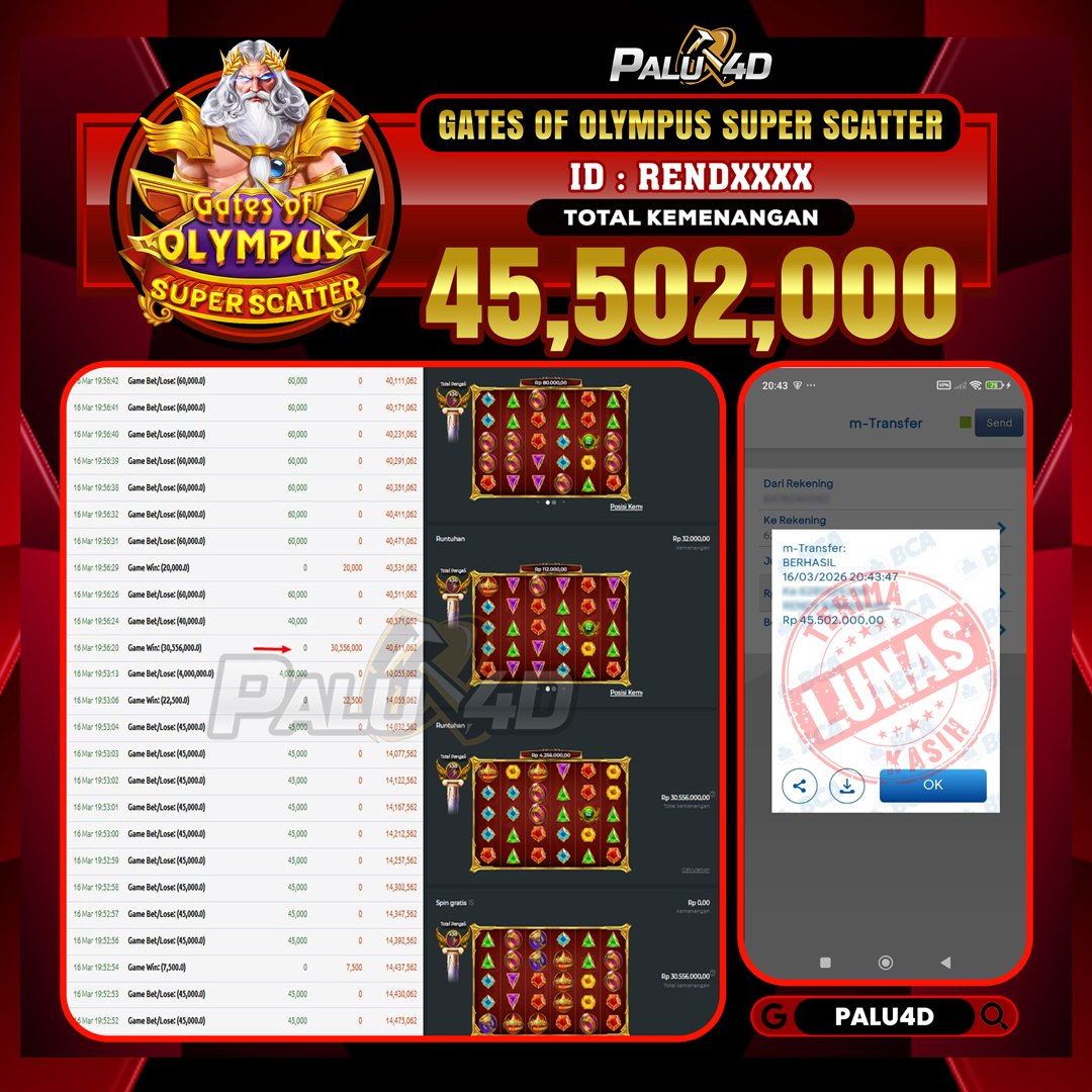 PALU4D – Selamat bagi pemenang yang mendapatkan jackpot hari ini 16 MARET 2026 di game Slot GATES OF OLYMPUS SUPER SCATTER  yang di sediakan situs palu4d dan sudah kami bayar lunas. Berikut data pemenang hari ini yang kami proses dengan cepat ke rekening tujuan yang terdaftar di akun selama ±10 menit.