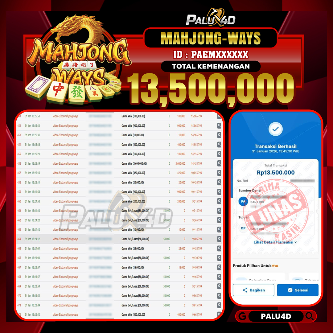 PALU4D – Selamat bagi pemenang yang mendapatkan jackpot hari ini 31 JANUARI 2026 di game Slot MAHJONG WAYS yang di sediakan situs palu4d dan sudah kami bayar lunas. Berikut data pemenang hari ini yang kami proses dengan cepat ke rekening tujuan yang terdaftar di akun selama ±10 menit.