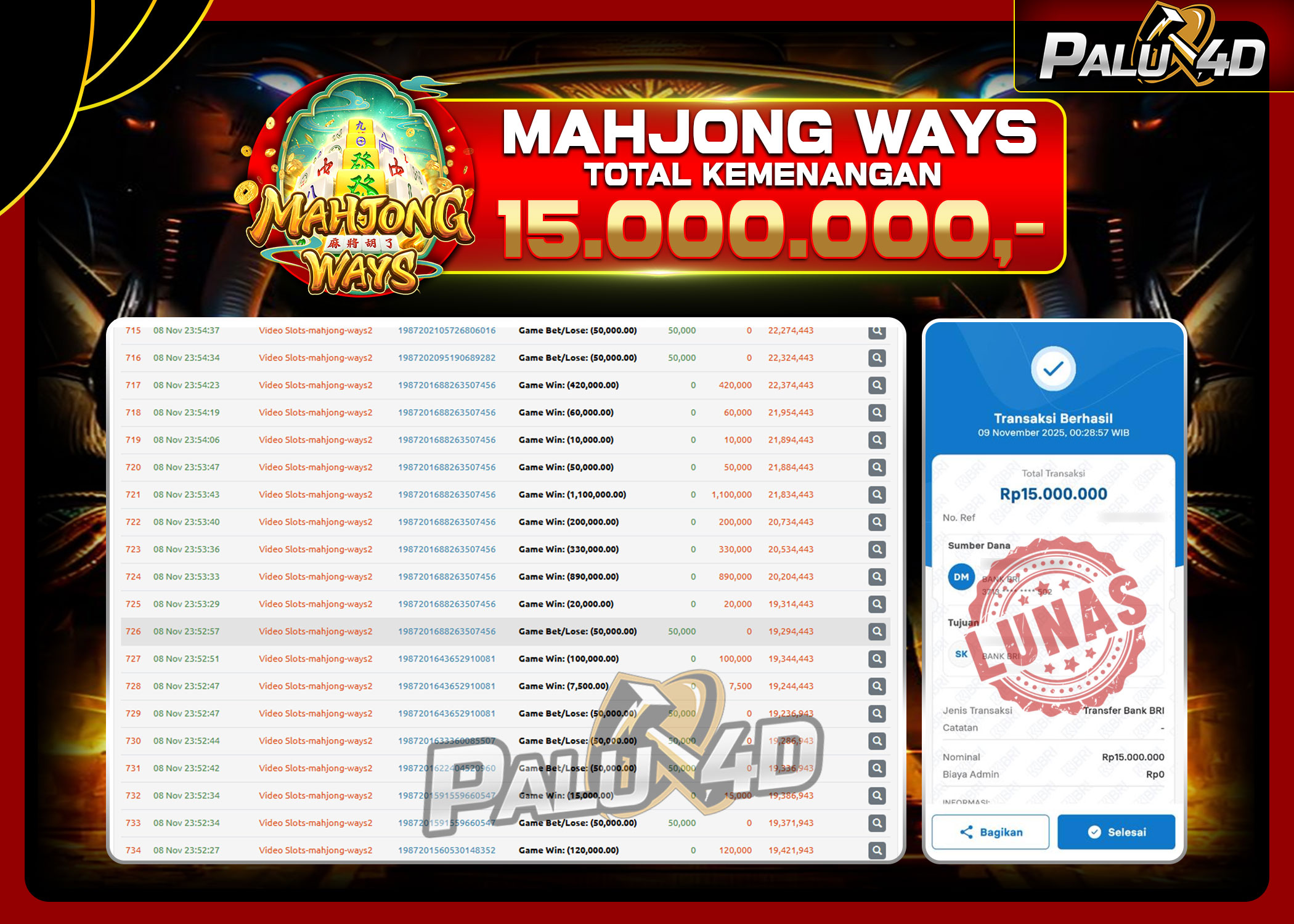 PALU4D – Selamat bagi pemenang yang mendapatkan jackpot hari ini 08 NOVEMBER 2025 di game Slot MAHJONG WAYS yang di sediakan situs palu4d dan sudah kami bayar lunas. Berikut data pemenang hari ini yang kami proses dengan cepat ke rekening tujuan yang terdaftar di akun selama ±10 menit.