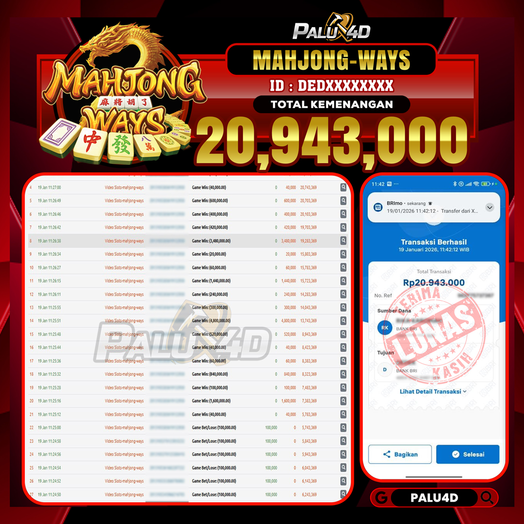 PALU4D – Selamat bagi pemenang yang mendapatkan jackpot hari ini 19 JANUARI 2026 di game Slot MAHJONG WAYS yang di sediakan situs palu4d dan sudah kami bayar lunas. Berikut data pemenang hari ini yang kami proses dengan cepat ke rekening tujuan yang terdaftar di akun selama ±10 menit.