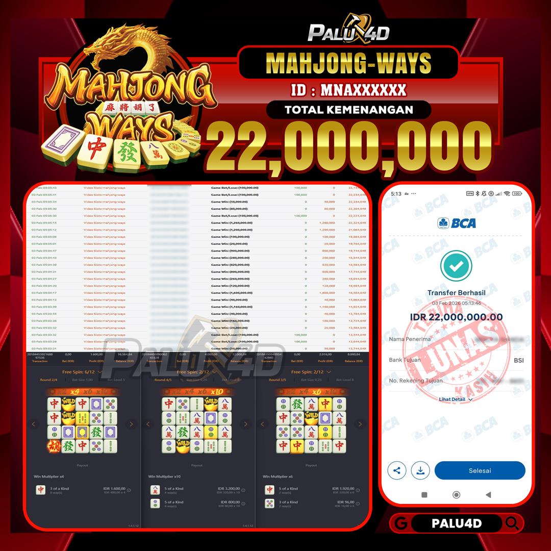 PALU4D – Selamat bagi pemenang yang mendapatkan jackpot hari ini 03 FEBRUARI 2026 di game Slot MAHJONG WAYS yang di sediakan situs palu4d dan sudah kami bayar lunas. Berikut data pemenang hari ini yang kami proses dengan cepat ke rekening tujuan yang terdaftar di akun selama ±10 menit.